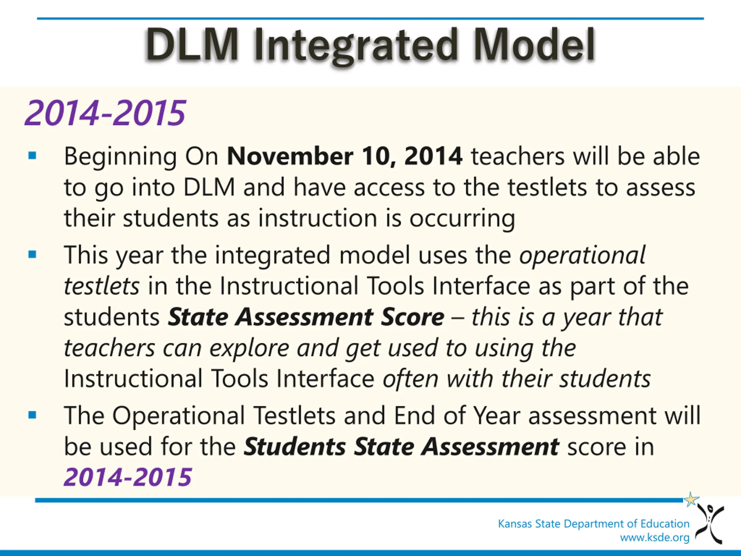 DLM Integrated Model 2014-2015 Beginning On November 10, 2014 teachers will be able to go into DLM and have access to the testlets to assess their students as instruction is occurring This year the integrated model uses the operational testlets in the Instructional Tools Interface as part of the students State Assessment Score this is a year that teachers can explore and get used to using the Instructional Tools Interface often with their students The Operational Testlets and End of Year assessment will be used for the Students State Assessment score in 2014-2015 Kansas State Department of Education www.ksde.org