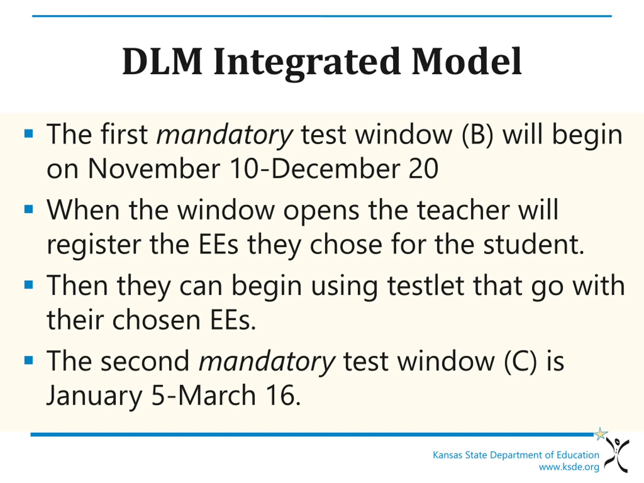 DLM Integrated Model The first mandatory test window (B) will begin on November 10-December 20 When the window opens the teacher will register the EEs they chose for the student. Then they can begin using testlet that go with their chosen EEs. The second mandatory test window (C) is January 5-March 16. Kansas State Department of Education www.ksde.org