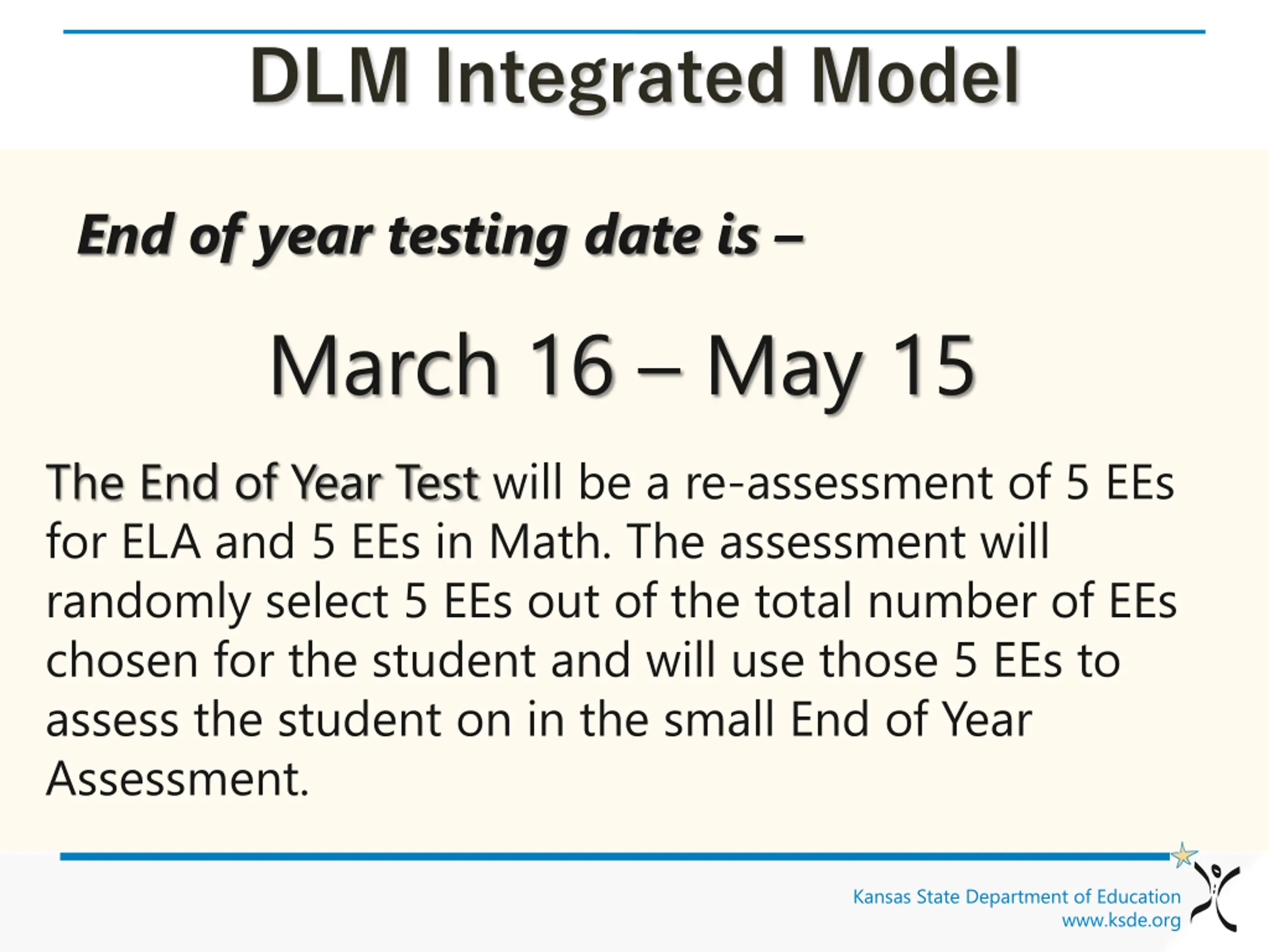 DLM Integrated Model End of year testing date is March 16 May 15 The End of Year Test will be a re-assessment of 5 EEs for ELA and 5 EEs in Math. The assessment will randomly select 5 EEs out of the total number of EEs chosen for the student and will use those 5 EEs to assess the student on in the small End of Year Assessment. Kansas State Department of Education www.ksde.org