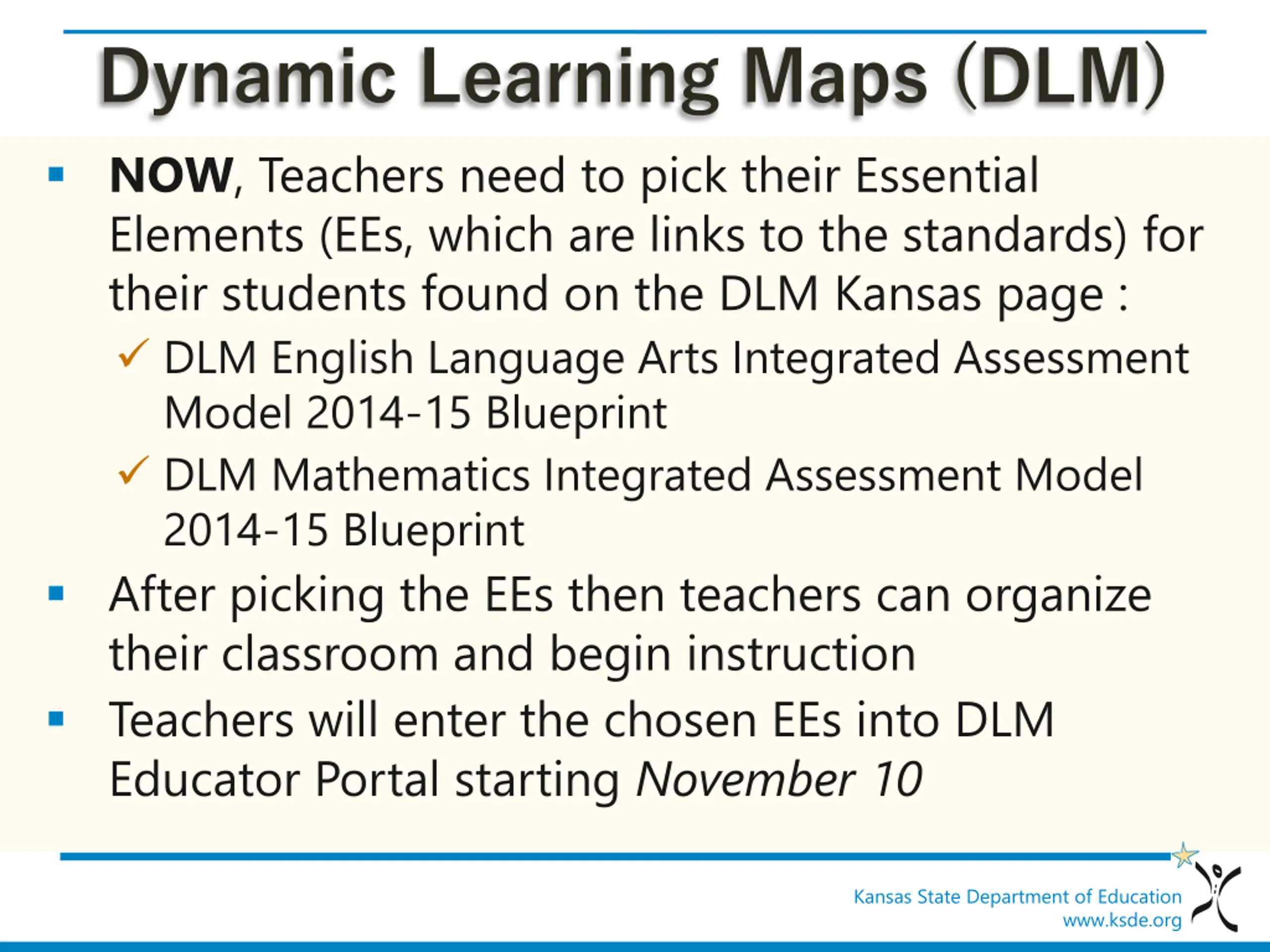 Dynamic Learning Maps (DLM) NOW, Teachers need to pick their Essential Elements (EEs, which are links to the standards) for their students found on the DLM Kansas page : DLM English Language Arts Integrated Assessment Model 2014-15 Blueprint DLM Mathematics Integrated Assessment Model 2014-15 Blueprint After picking the EEs then teachers can organize their classroom and begin instruction Teachers will enter the chosen EEs into DLM Educator Portal starting November 10 Kansas State Department of Education www.ksde.org