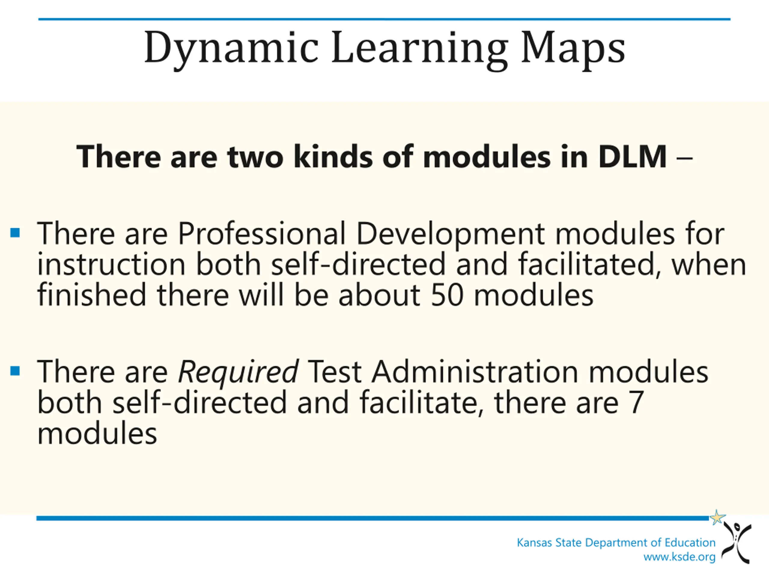 Dynamic Learning Maps There are two kinds of modules in DLM There are Professional Development modules for instruction both self-directed and facilitated, when finished there will be about 50 modules There are Required Test Administration modules both self-directed and facilitate, there are 7 modules Kansas State Department of Education www.ksde.org