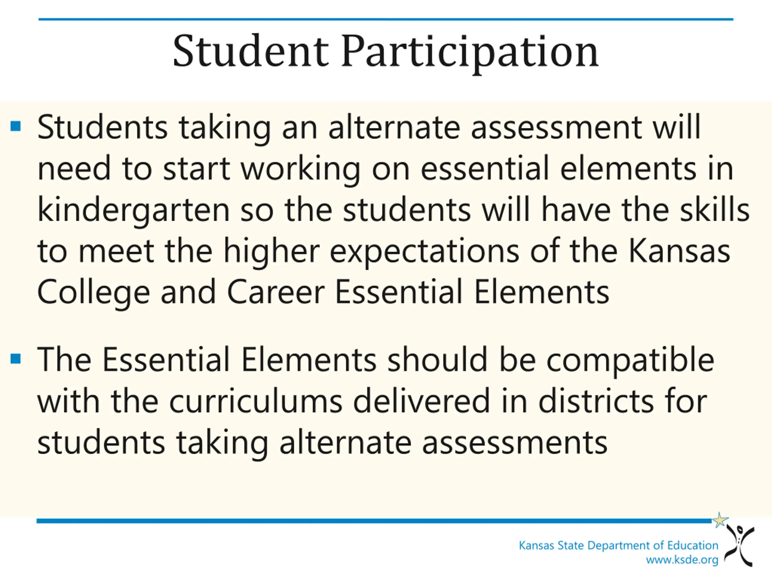 Student Participation Students taking an alternate assessment will need to start working on essential elements in kindergarten so the students will have the skills to meet the higher expectations of the Kansas College and Career Essential Elements The Essential Elements should be compatible with the curriculums delivered in districts for students taking alternate assessments Kansas State Department of Education www.ksde.org