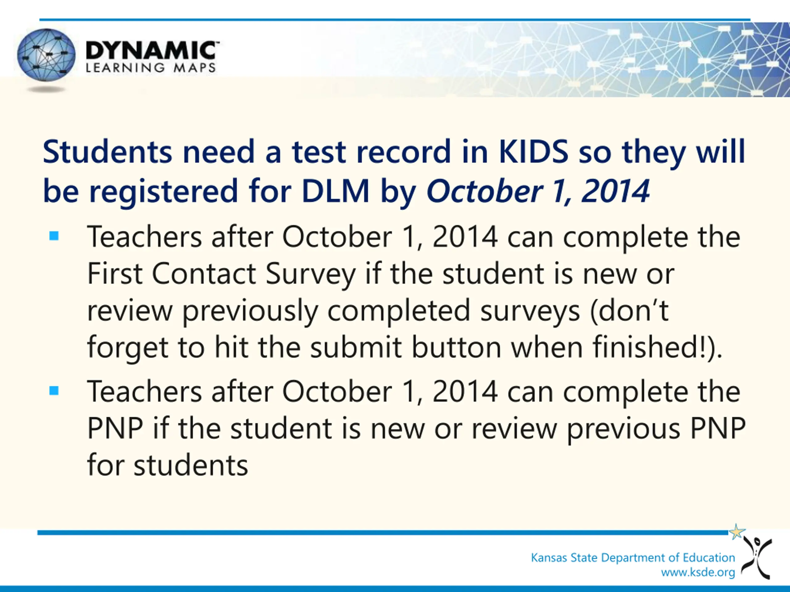 Students need a test record in KIDS so they will be registered for DLM by October 1, 2014 Teachers after October 1, 2014 can complete the First Contact Survey if the student is new or review previously completed surveys (don t forget to hit the submit button when finished!). Teachers after October 1, 2014 can complete the PNP if the student is new or review previous PNP for students Kansas State Department of Education www.ksde.org