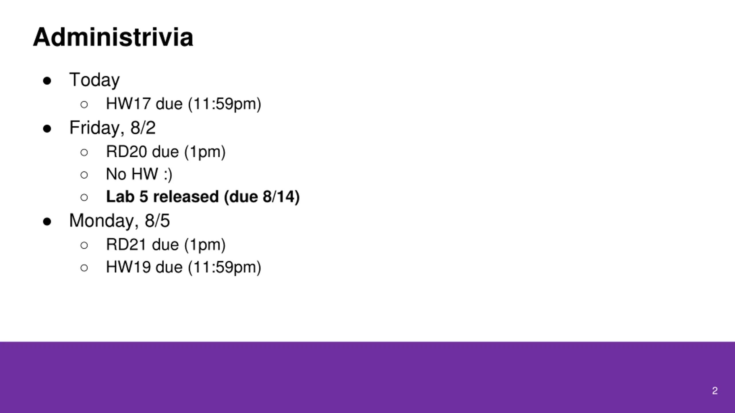 Administrivia Today Friday, 8/2 Monday, 8/5 RD21 due (1pm) HW19 due (11:59pm) HW17 due (11:59pm) RD20 due (1pm) No HW :) Lab 5 released (due 8/14) 2