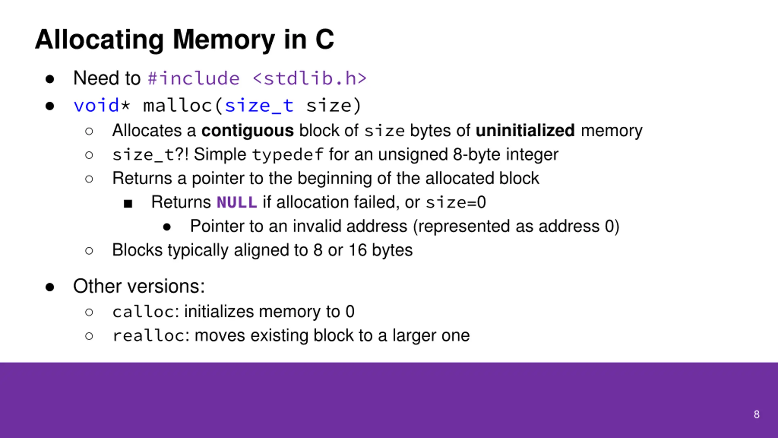 Allocating Memory in C Need to #include <stdlib.h> void* malloc(size_t size) Allocates a contiguous block of size bytes of uninitialized memory size_t?! Simple typedef for an unsigned 8-byte integer Returns a pointer to the beginning of the allocated block Returns NULL if allocation failed, or size=0 Pointer to an invalid address (represented as address 0) Blocks typically aligned to 8 or 16 bytes Other versions: calloc: initializes memory to 0 realloc: moves existing block to a larger one 8