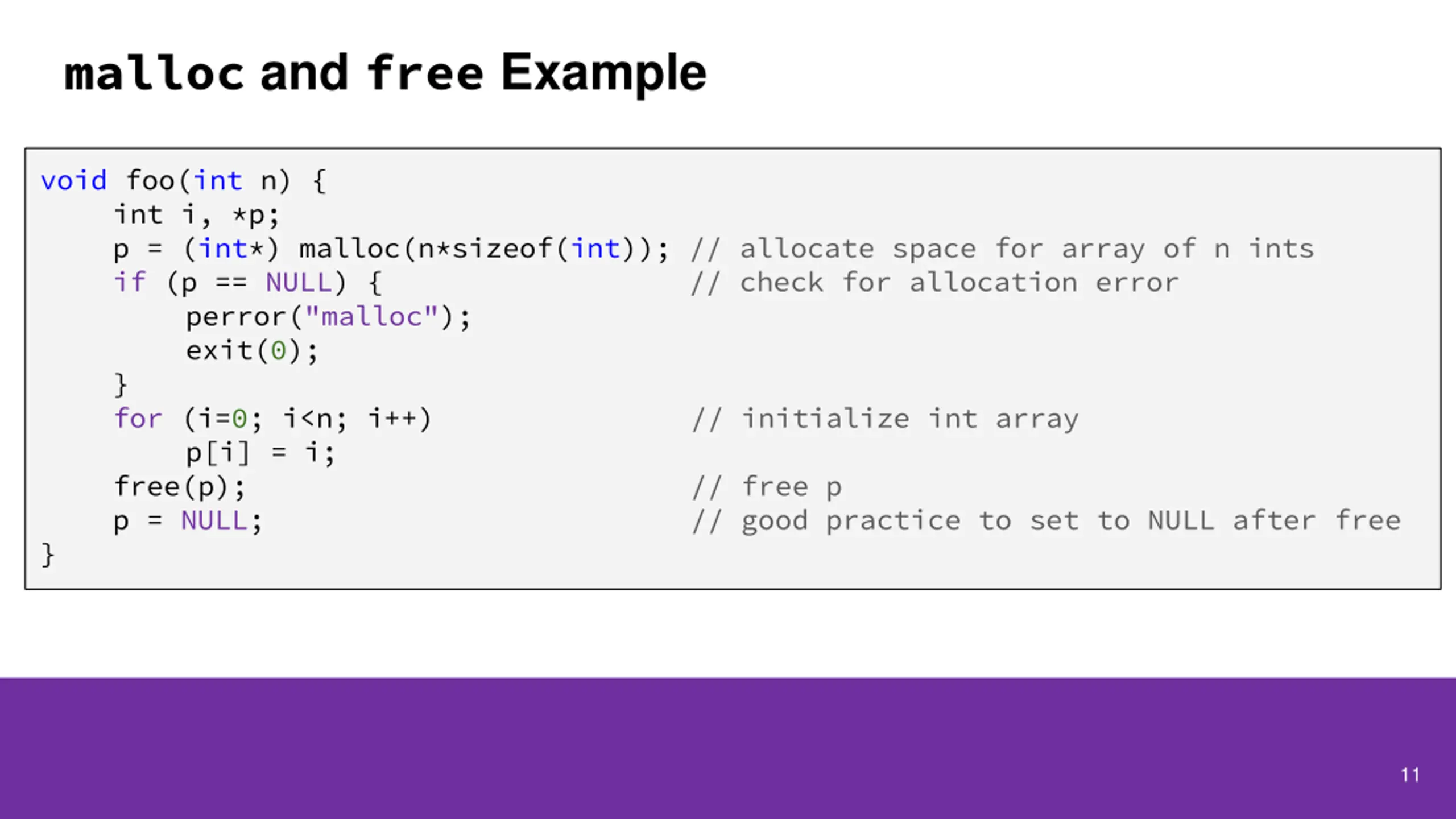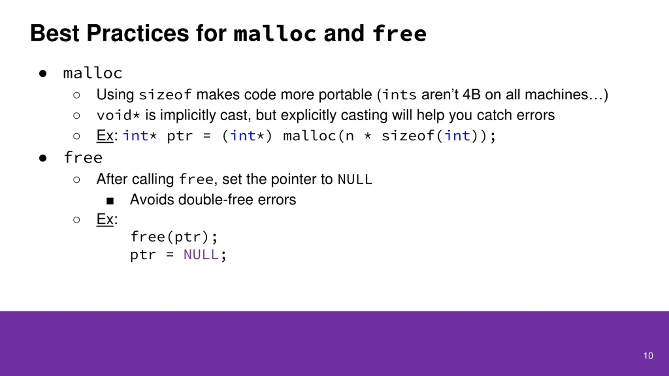 Best Practices for malloc and free malloc free Using sizeof makes code more portable (ints aren t 4B on all machines ) void* is implicitly cast, but explicitly casting will help you catch errors Ex: int* ptr = (int*) malloc(n * sizeof(int)); After calling free, set the pointer to NULL Avoids double-free errors Ex: free(ptr); ptr = NULL; 10