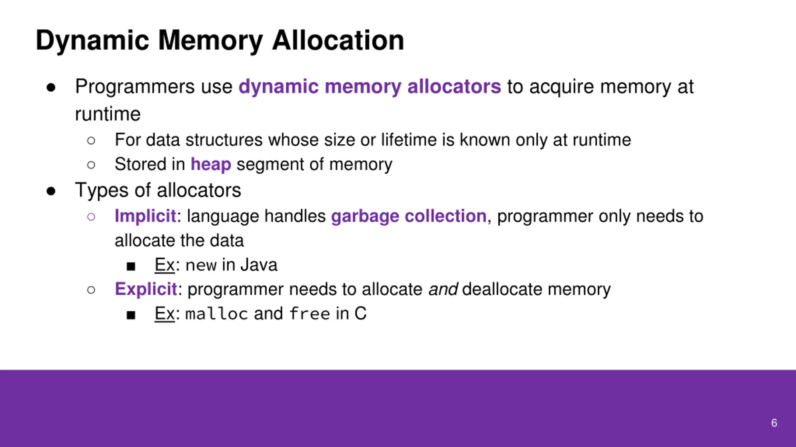 Dynamic Memory Allocation Programmers use dynamic memory allocators to acquire memory at runtime For data structures whose size or lifetime is known only at runtime Stored in heap segment of memory Types of allocators Implicit: language handles garbage collection, programmer only needs to allocate the data Ex: new in Java Explicit: programmer needs to allocate and deallocate memory Ex: malloc and free in C 6