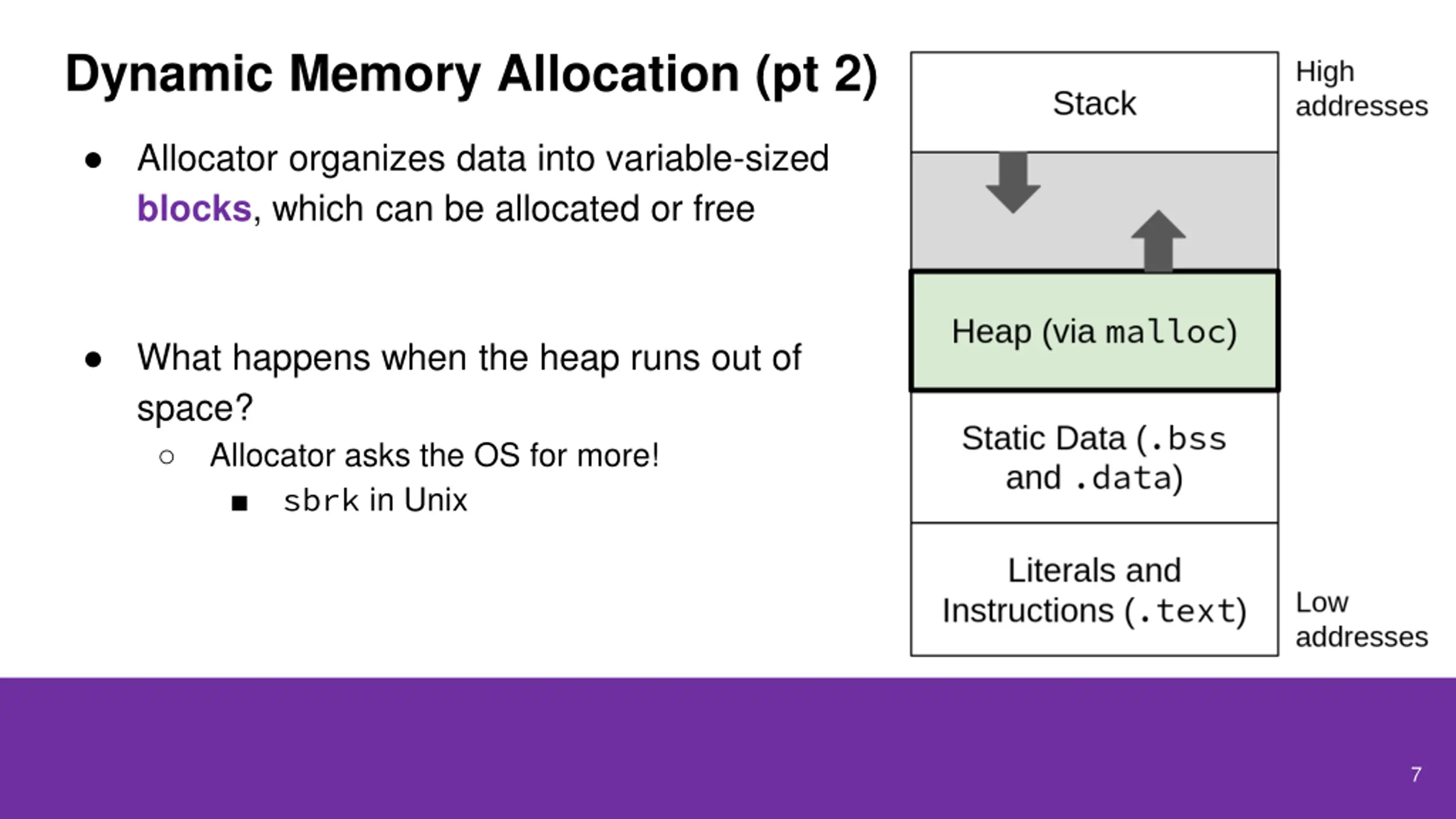 Dynamic Memory Allocation (pt 2) Allocator organizes data into variable-sized blocks, which can be allocated or free What happens when the heap runs out of space? Allocator asks the OS for more! sbrk in Unix 7