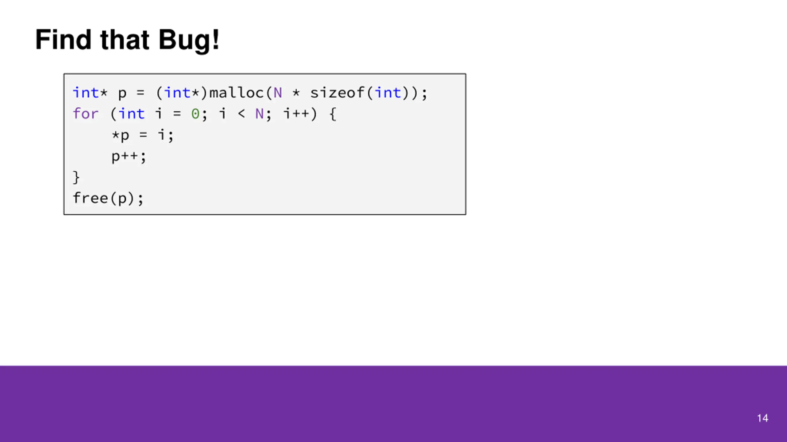 Find that Bug! int* p = (int*)malloc(N * sizeof(int)); for (int i = 0; i < N; i++) { *p = i; p++; } free(p); 14