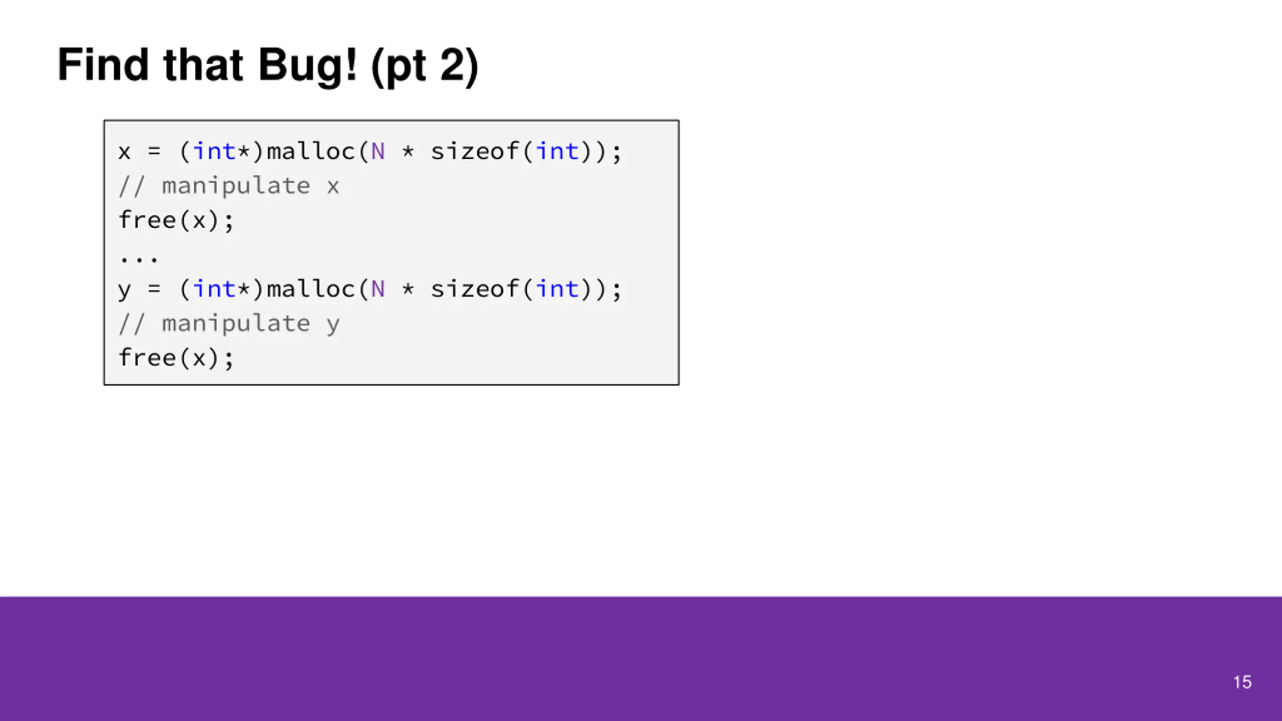 Find that Bug! (pt 2) x = (int*)malloc(N * sizeof(int)); // manipulate x free(x); ... y = (int*)malloc(N * sizeof(int)); // manipulate y free(x); 15