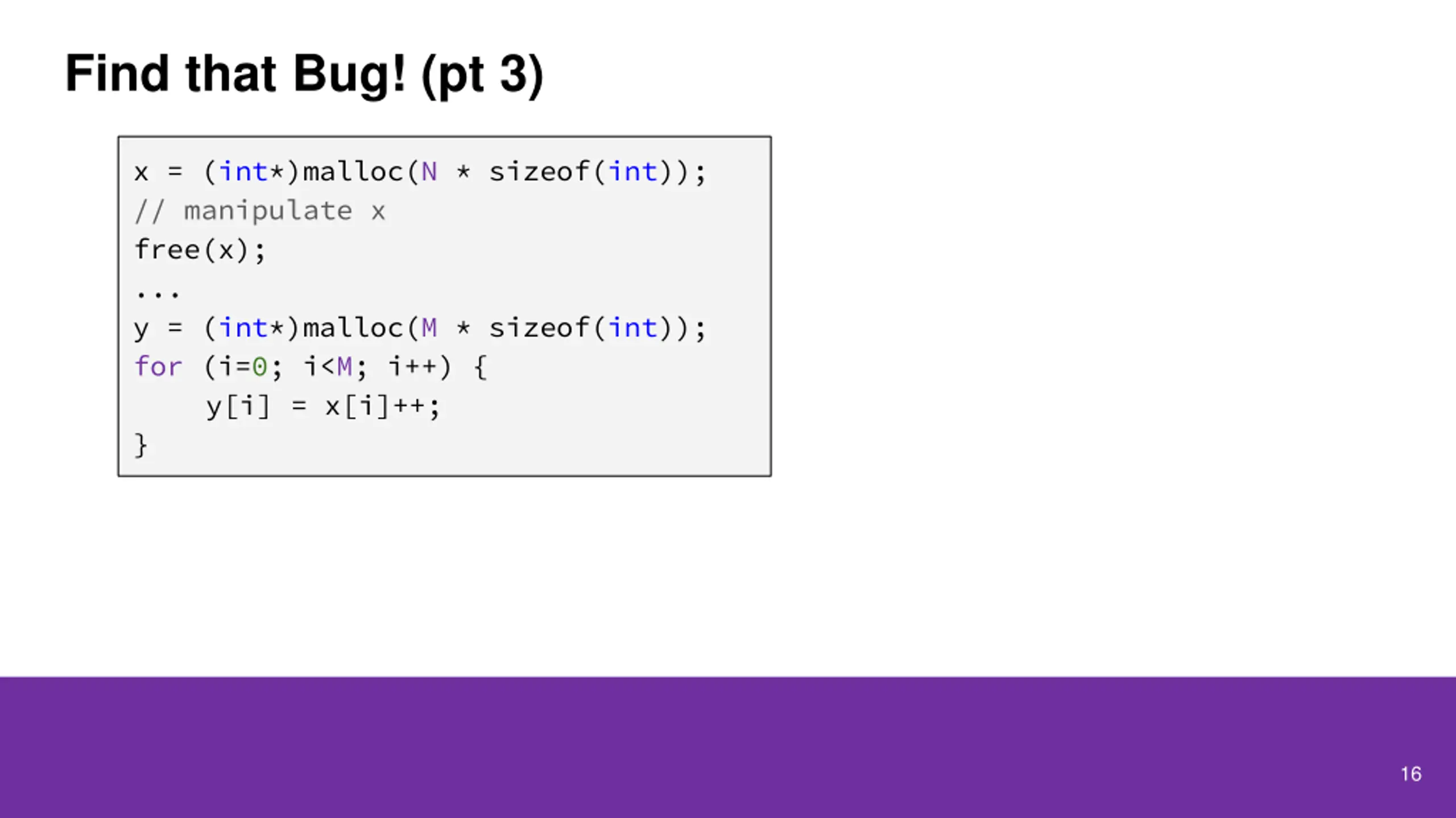 Find that Bug! (pt 3) x = (int*)malloc(N * sizeof(int)); // manipulate x free(x); ... y = (int*)malloc(M * sizeof(int)); for (i=0; i<M; i++) { y[i] = x[i]++; } 16