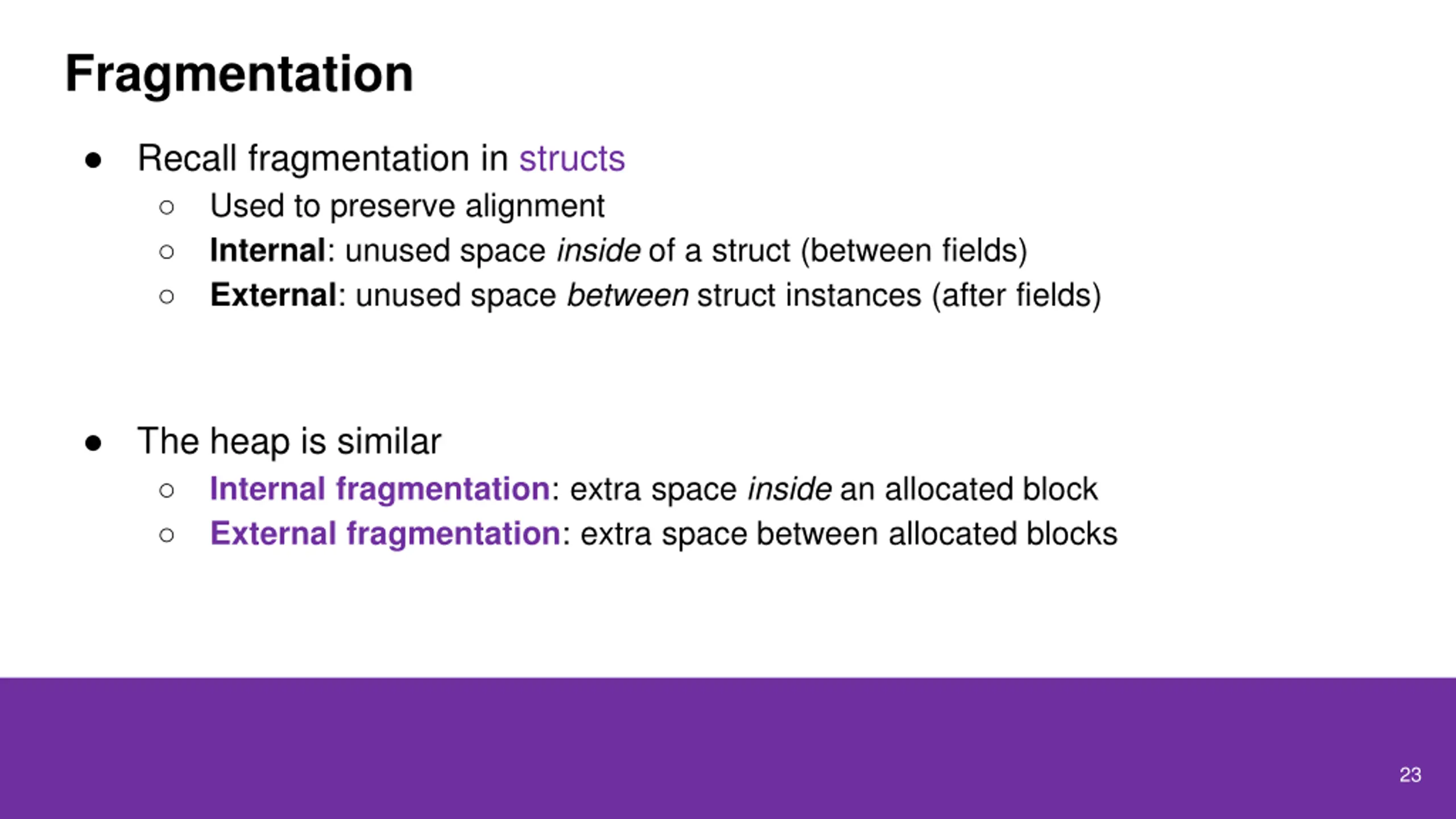 Fragmentation Recall fragmentation in structs Used to preserve alignment Internal: unused space inside of a struct (between fields) External: unused space between struct instances (after fields) The heap is similar Internal fragmentation: extra space inside an allocated block External fragmentation: extra space between allocated blocks 23