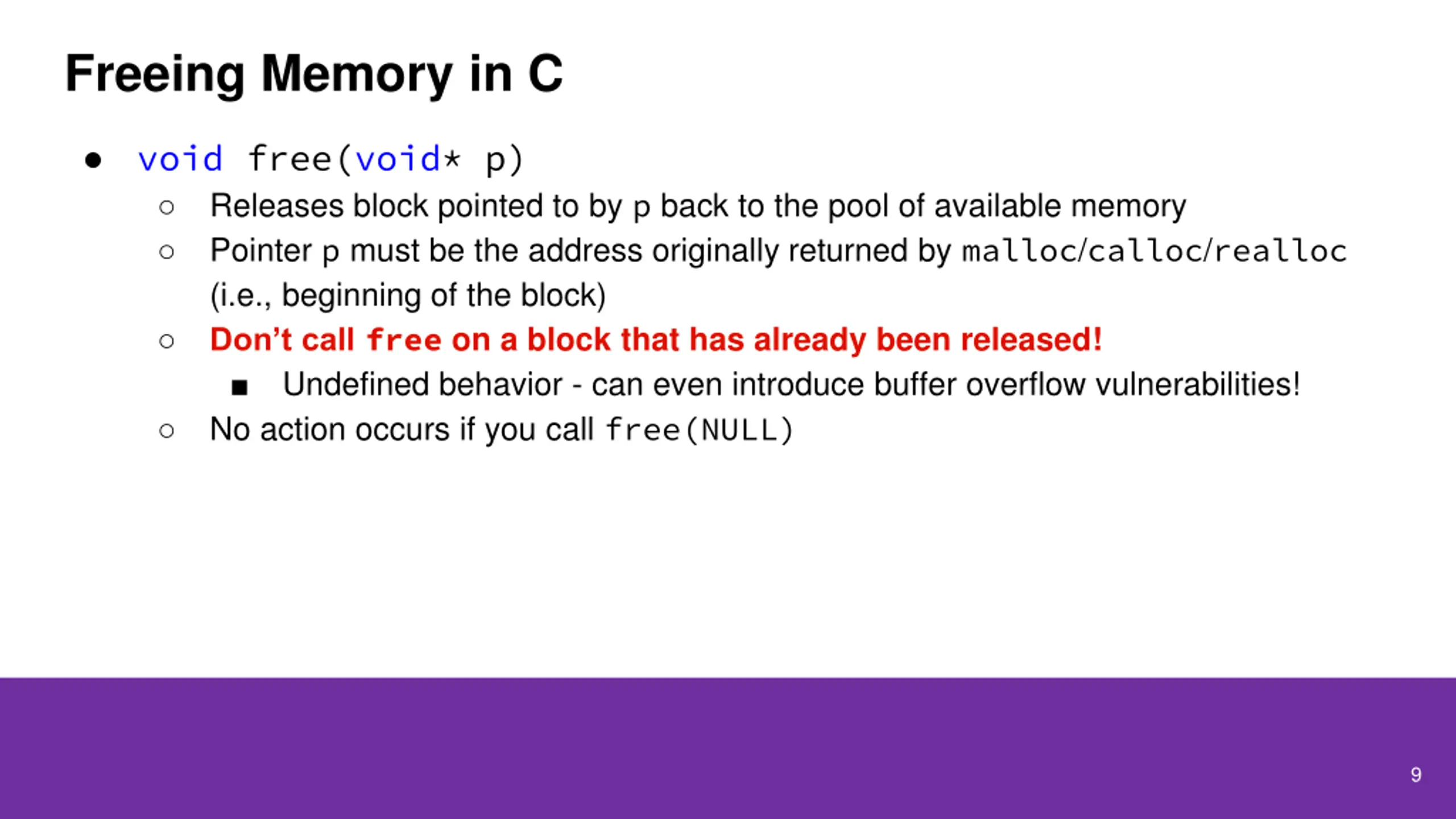 Freeing Memory in C void free(void* p) Releases block pointed to by p back to the pool of available memory Pointer p must be the address originally returned by malloc/calloc/realloc (i.e., beginning of the block) Don t call free on a block that has already been released! Undefined behavior - can even introduce buffer overflow vulnerabilities! No action occurs if you call free(NULL) 9