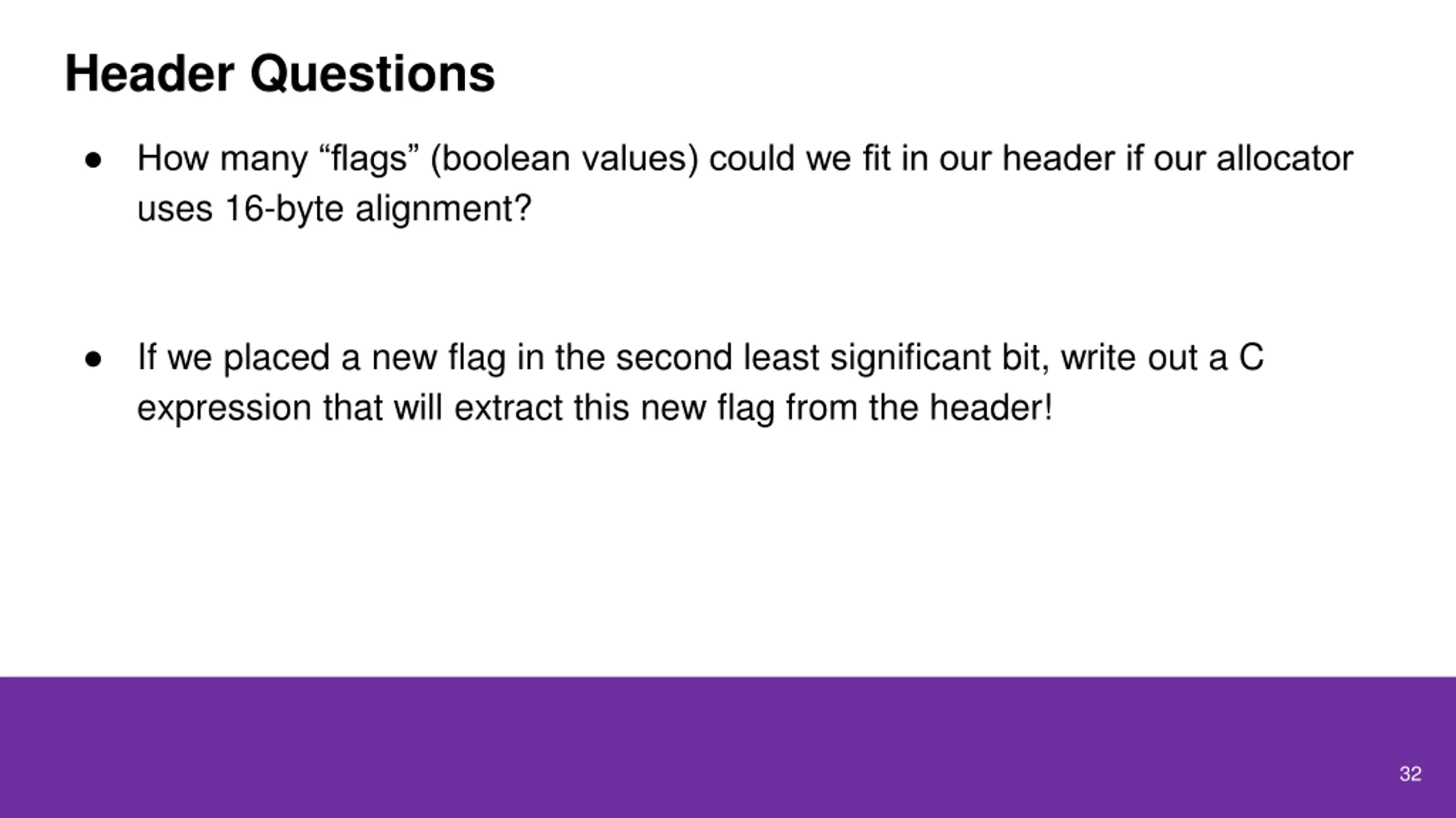 Header Questions How many flags (boolean values) could we fit in our header if our allocator uses 16-byte alignment? If we placed a new flag in the second least significant bit, write out a C expression that will extract this new flag from the header! 32