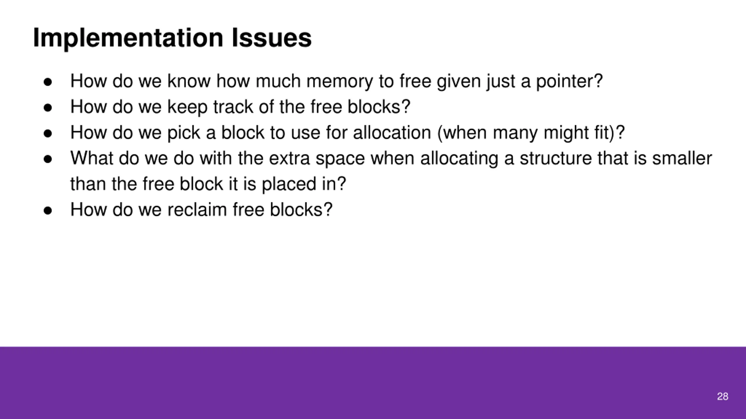 Implementation Issues How do we know how much memory to free given just a pointer? How do we keep track of the free blocks? How do we pick a block to use for allocation (when many might fit)? What do we do with the extra space when allocating a structure that is smaller than the free block it is placed in? How do we reclaim free blocks? 28