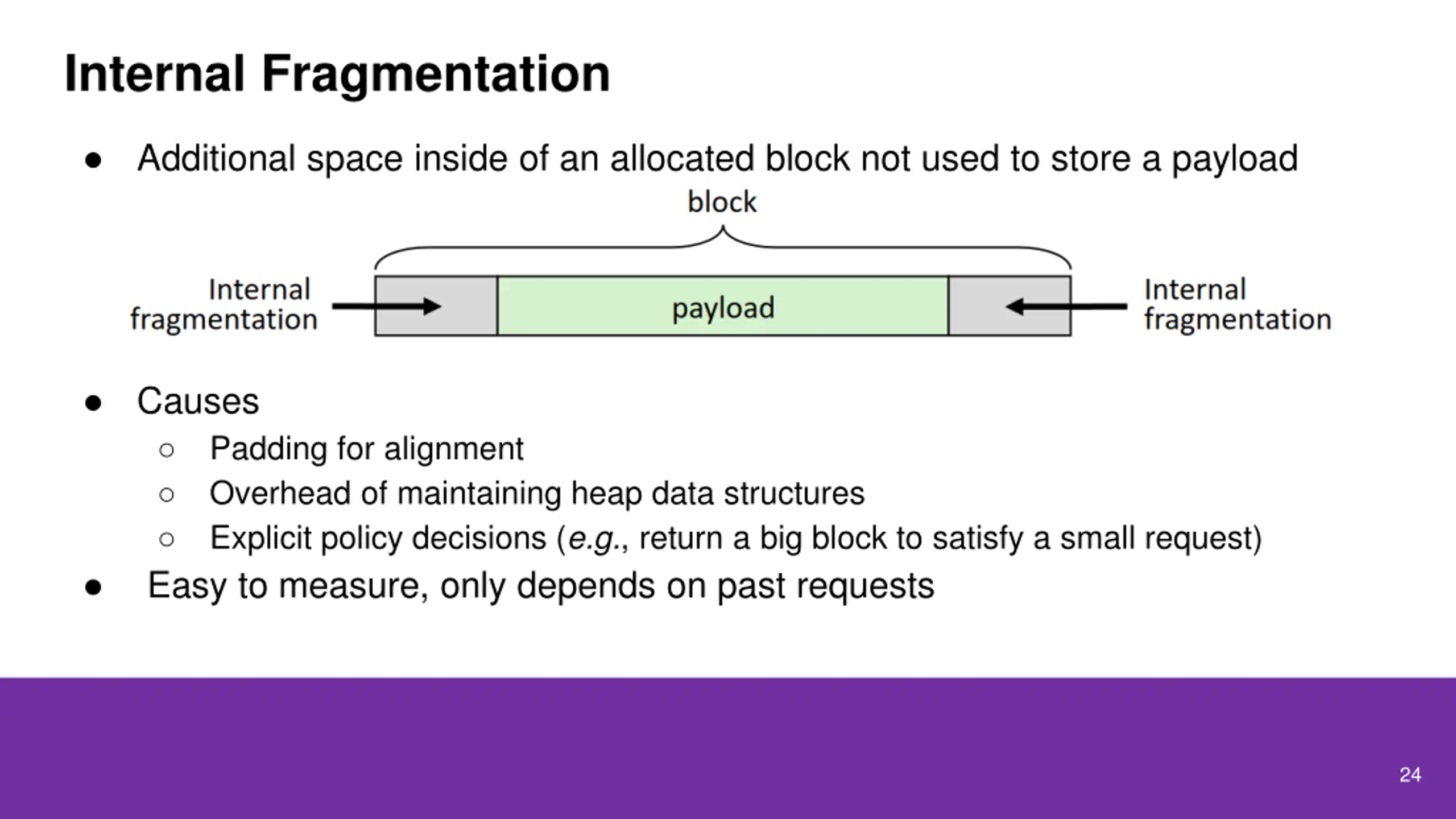 Internal Fragmentation Additional space inside of an allocated block not used to store a payload Causes Easy to measure, only depends on past requests Padding for alignment Overhead of maintaining heap data structures Explicit policy decisions (e.g., return a big block to satisfy a small request) 24
