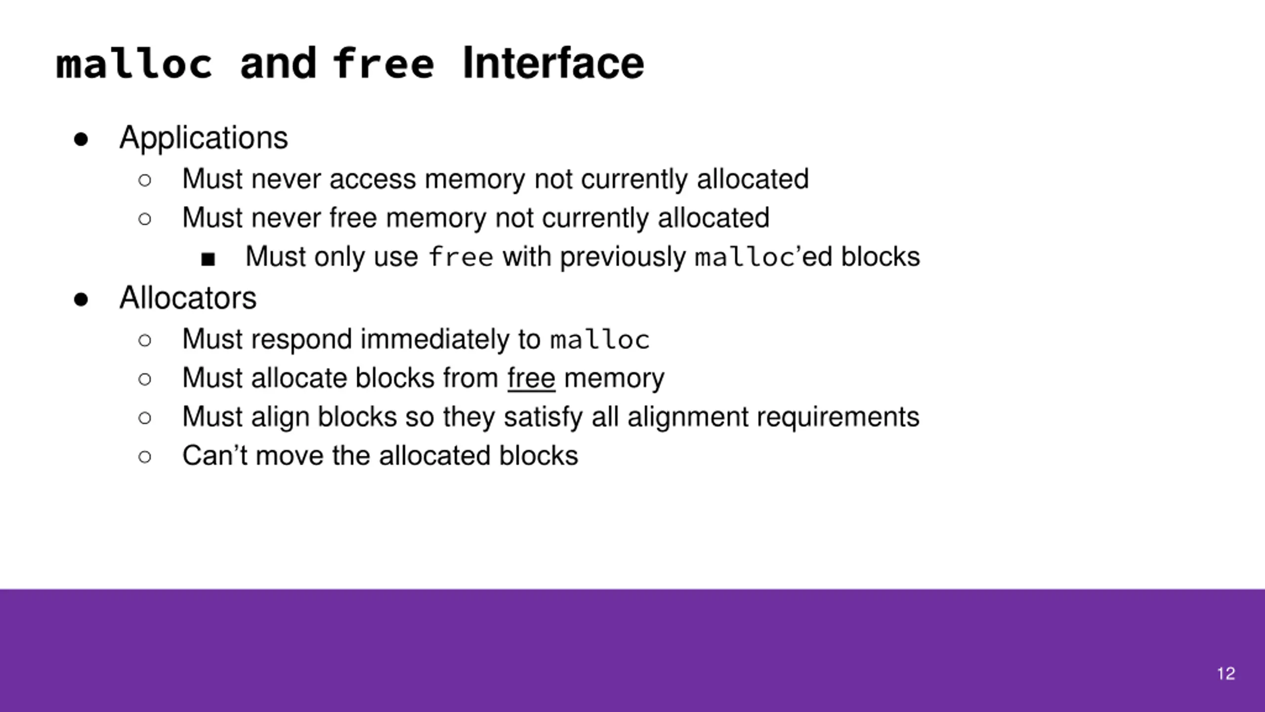 malloc and free Interface Applications Must never access memory not currently allocated Must never free memory not currently allocated Must only use free with previously malloc ed blocks Allocators Must respond immediately to malloc Must allocate blocks from free memory Must align blocks so they satisfy all alignment requirements Can t move the allocated blocks 12