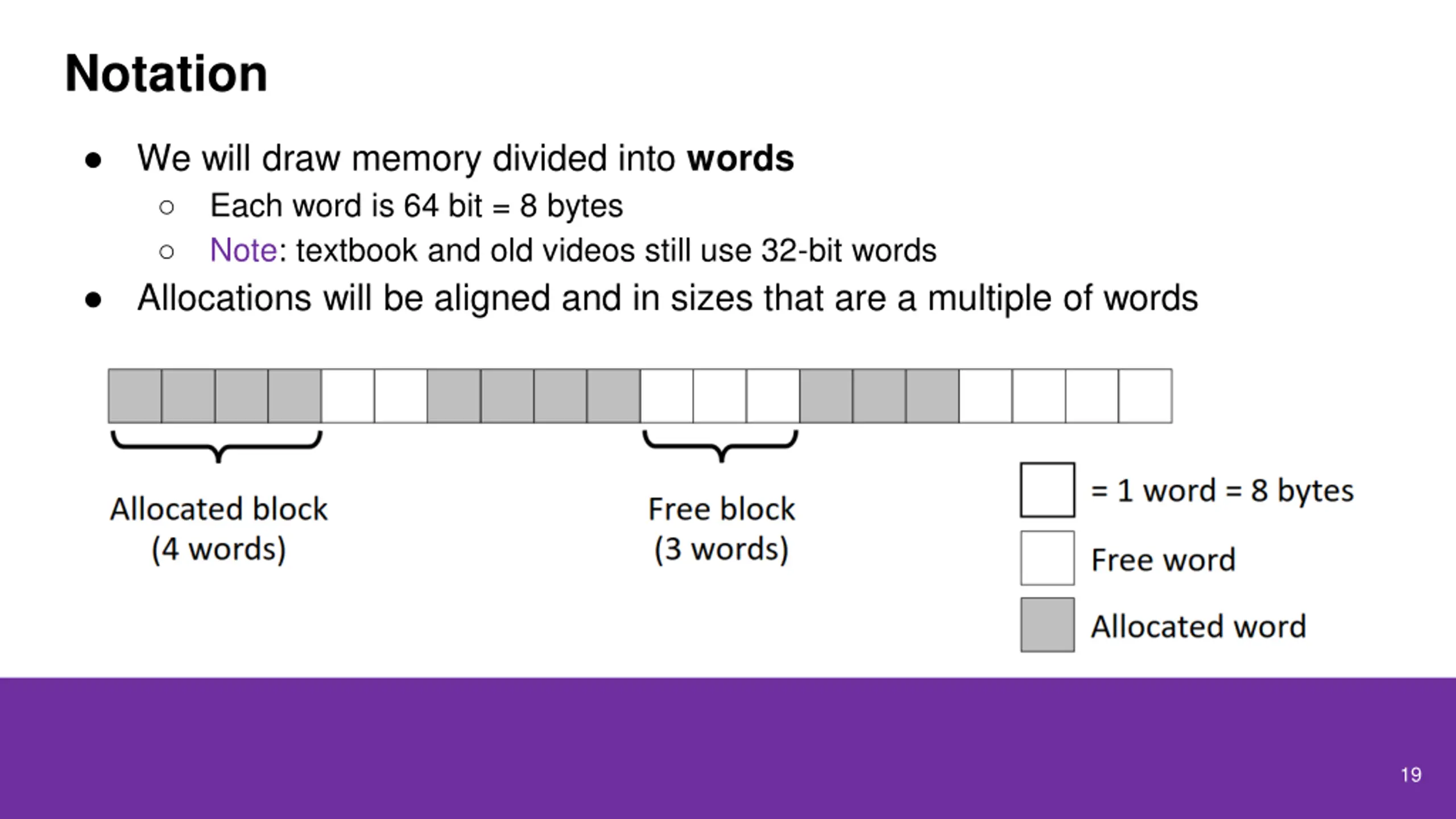 Notation We will draw memory divided into words Each word is 64 bit = 8 bytes Note: textbook and old videos still use 32-bit words Allocations will be aligned and in sizes that are a multiple of words 19