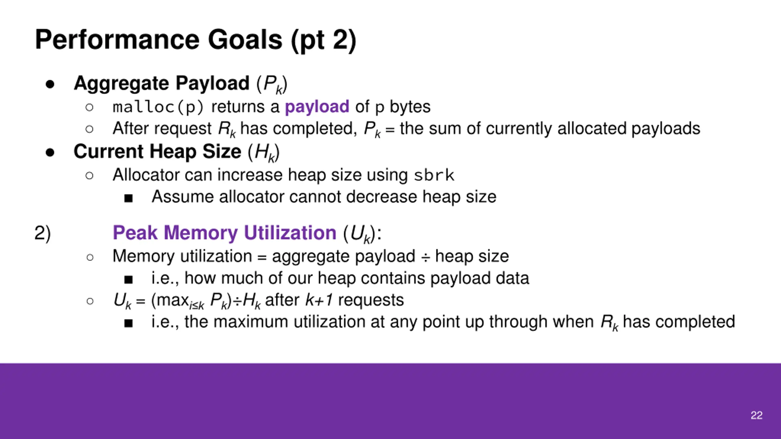 Performance Goals (pt 2) Aggregate Payload (Pk) malloc(p) returns a payload of p bytes After request Rkhas completed, Pk= the sum of currently allocated payloads Current Heap Size (Hk) Allocator can increase heap size using sbrk Assume allocator cannot decrease heap size 2) Peak Memory Utilization (Uk): Memory utilization = aggregate payload heap size i.e., how much of our heap contains payload data Uk= (maxi kPk) Hkafter k+1 requests i.e., the maximum utilization at any point up through when Rkhas completed 22