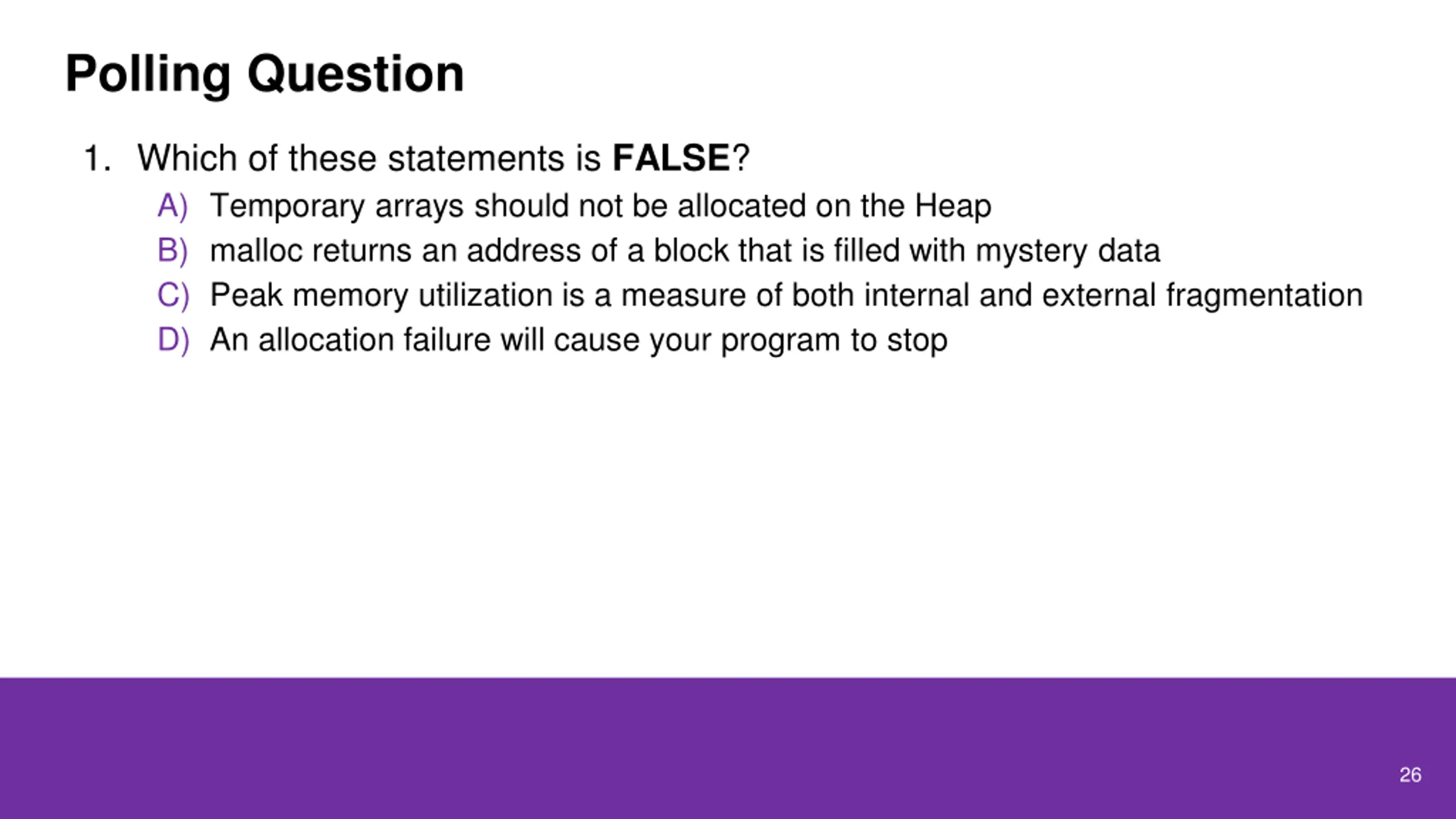 Polling Question 1. Which of these statements is FALSE? A) Temporary arrays should not be allocated on the Heap B) malloc returns an address of a block that is filled with mystery data C) Peak memory utilization is a measure of both internal and external fragmentation D) An allocation failure will cause your program to stop 26