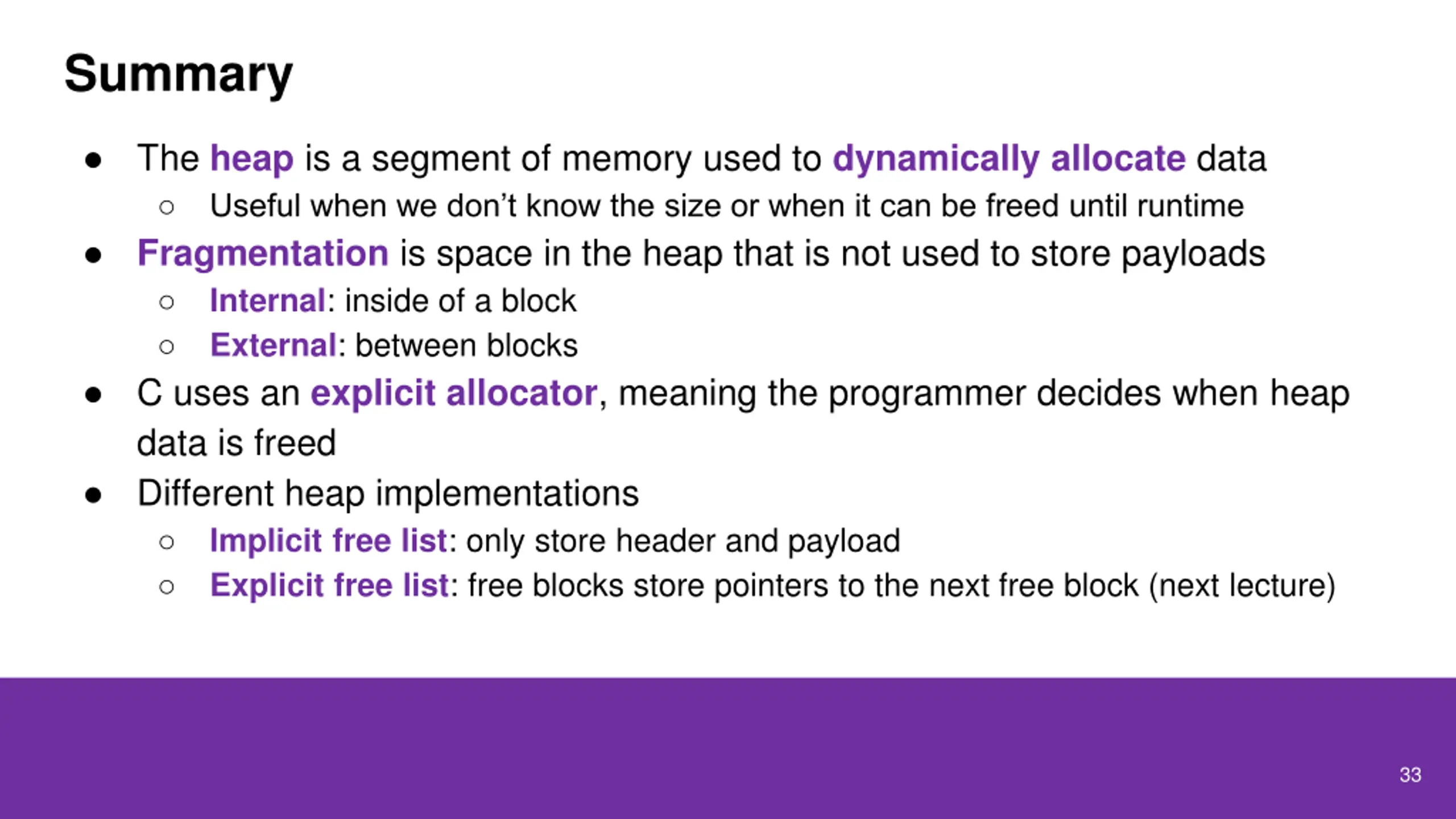 Summary The heap is a segment of memory used to dynamically allocate data Useful when we don t know the size or when it can be freed until runtime Fragmentation is space in the heap that is not used to store payloads Internal: inside of a block External: between blocks C uses an explicit allocator, meaning the programmer decides when heap data is freed Different heap implementations Implicit free list: only store header and payload Explicit free list: free blocks store pointers to the next free block (next lecture) 33