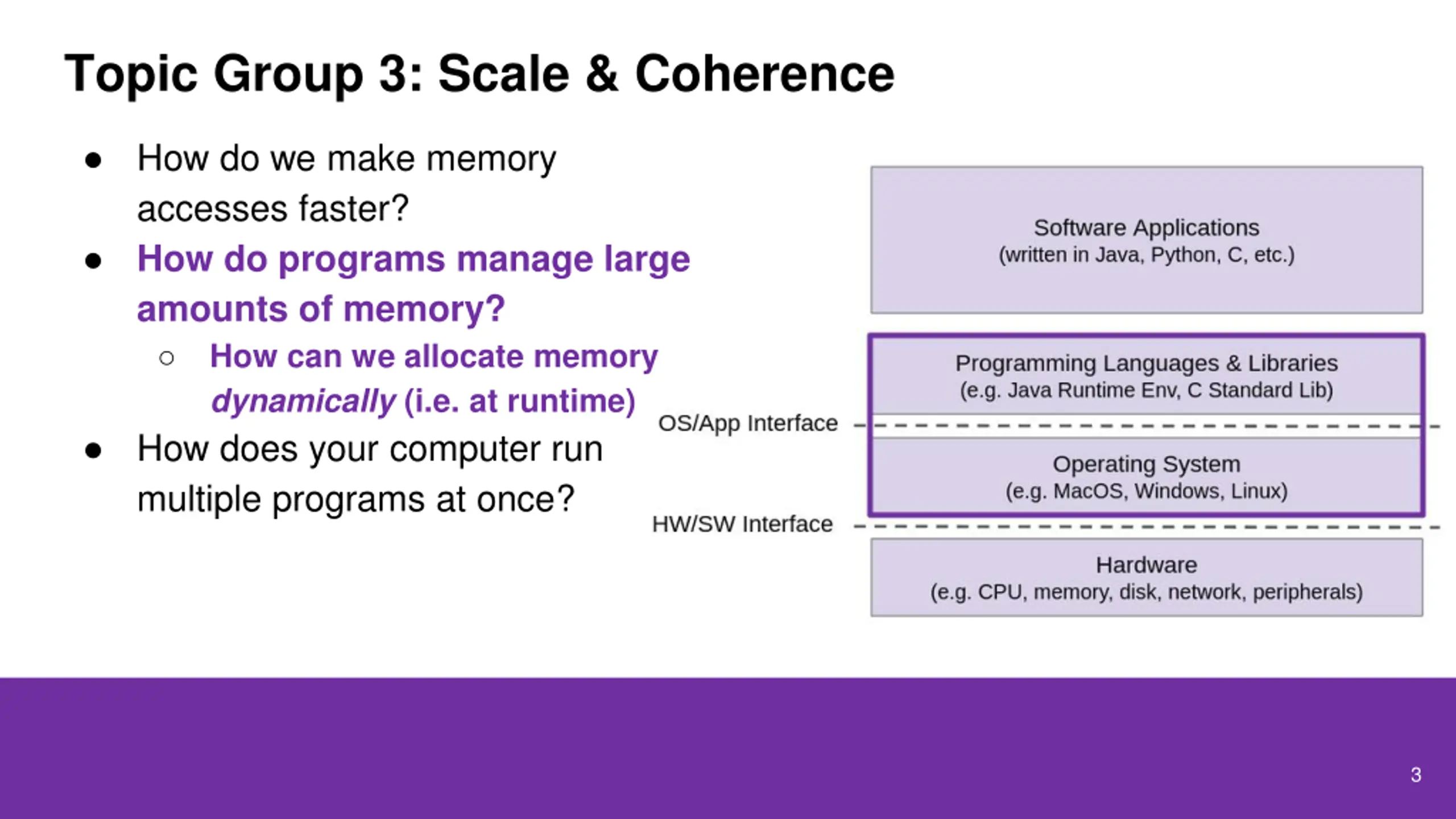 Topic Group 3: Scale & Coherence How do we make memory accesses faster? How do programs manage large amounts of memory? How can we allocate memory dynamically (i.e. at runtime) How does your computer run multiple programs at once? 3