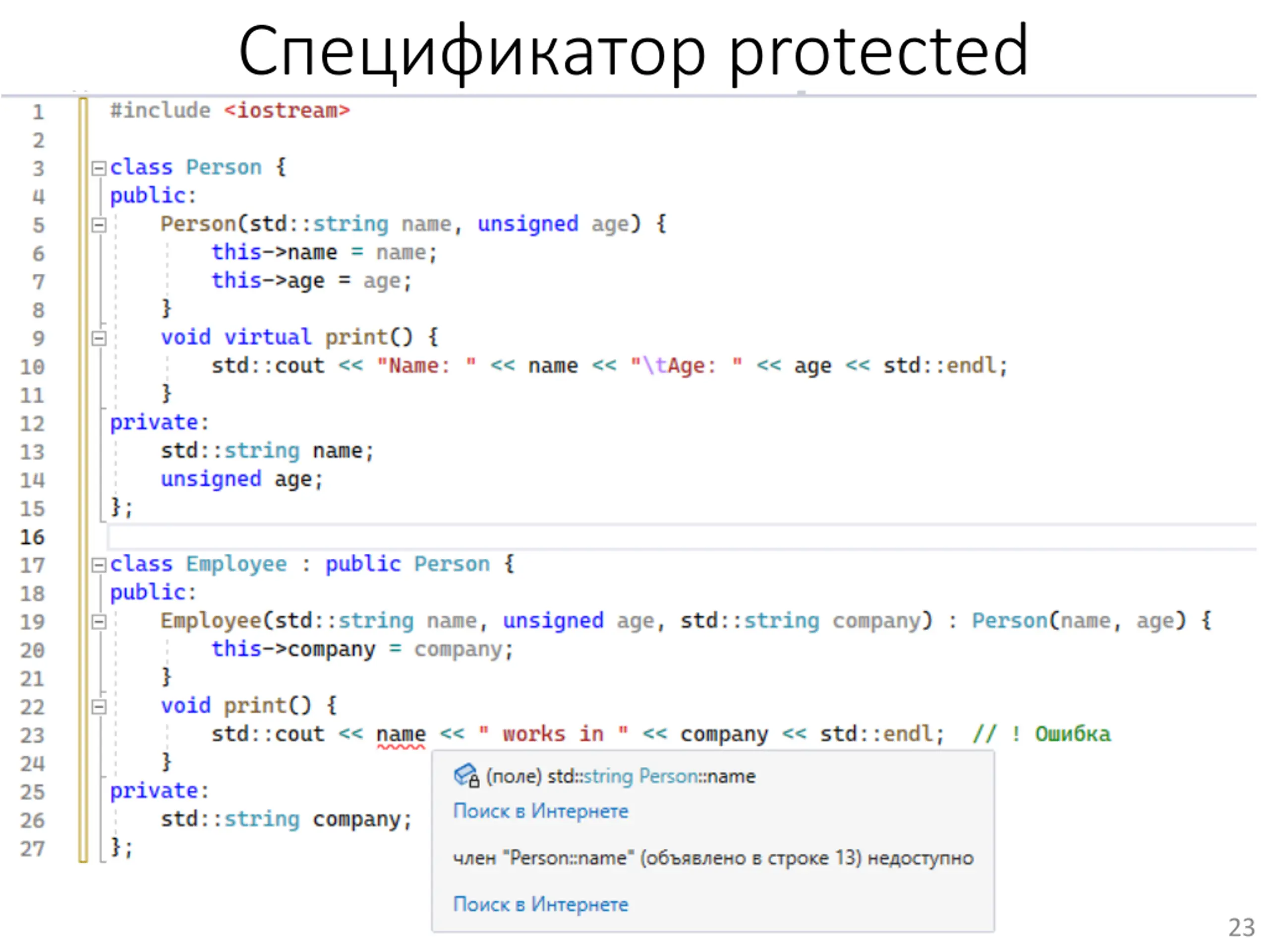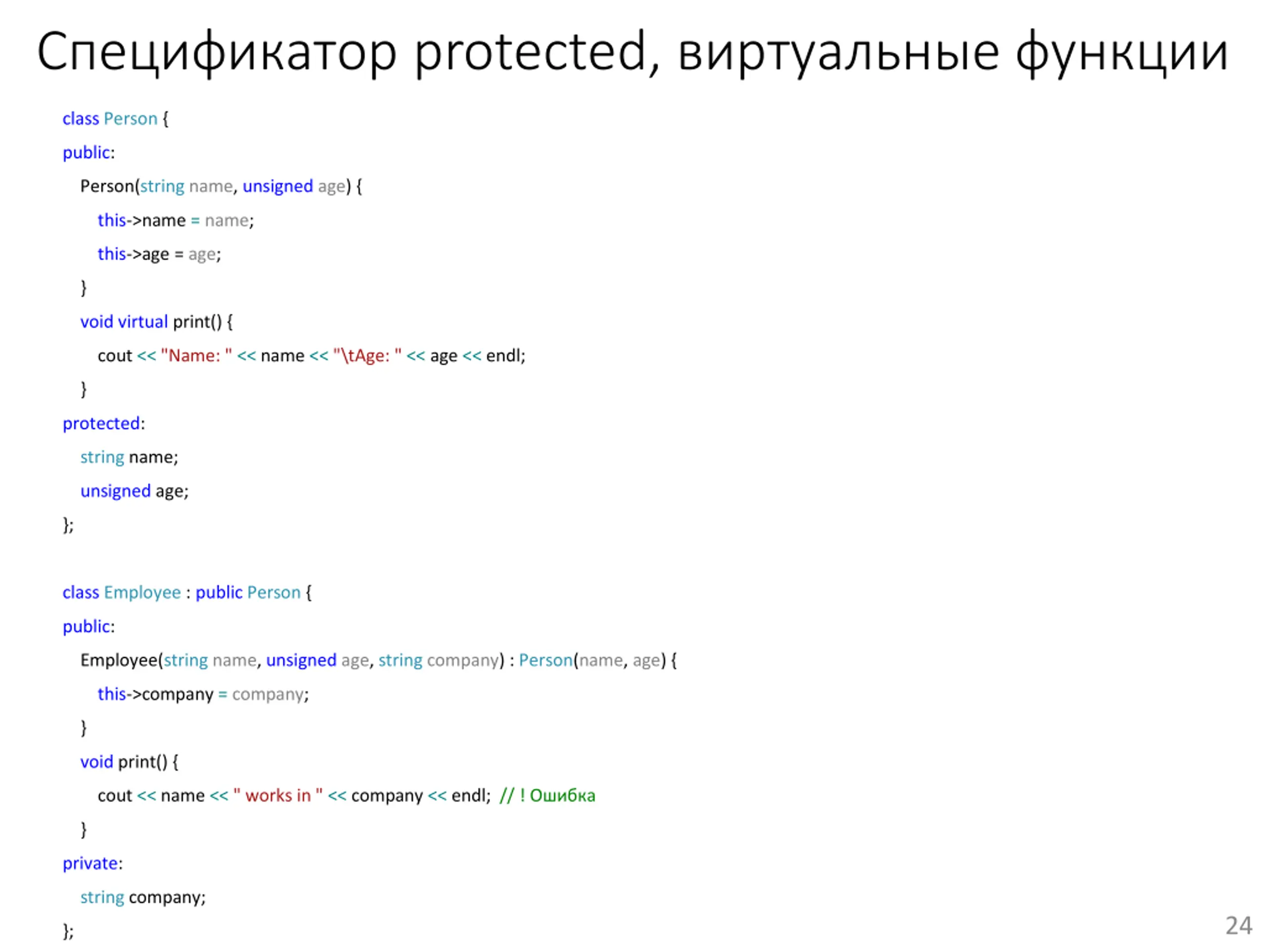 protected, class Person { public: Person(string name, unsigned age) { this->name = name; this->age = age; } void virtual print() { cout << "Name: " << name << "\tAge: " << age << endl; } protected: string name; unsigned age; }; class Employee : public Person { public: Employee(string name, unsigned age, string company) : Person(name, age) { this->company = company; } void print() { cout << name << " works in " << company << endl; // ! } private: string company; 24 };