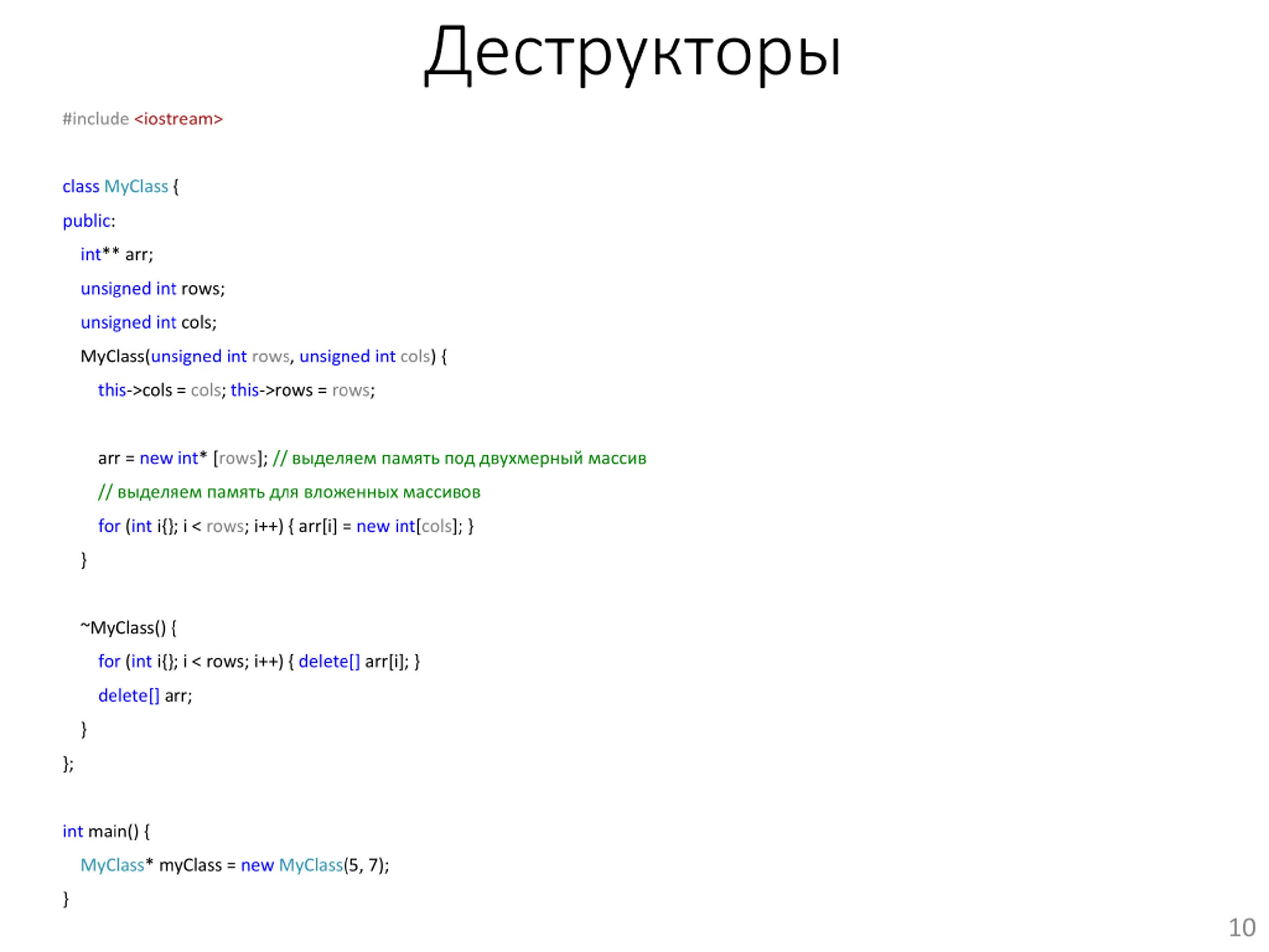#include <iostream> class MyClass { public: int** arr; unsigned int rows; unsigned int cols; MyClass(unsigned int rows, unsigned int cols) { this->cols = cols; this->rows = rows; arr = new int* [rows]; // // for (int i{}; i < rows; i++) { arr[i] = new int[cols]; } } ~MyClass() { for (int i{}; i < rows; i++) { delete[] arr[i]; } delete[] arr; } }; int main() { MyClass* myClass = new MyClass(5, 7); } 10