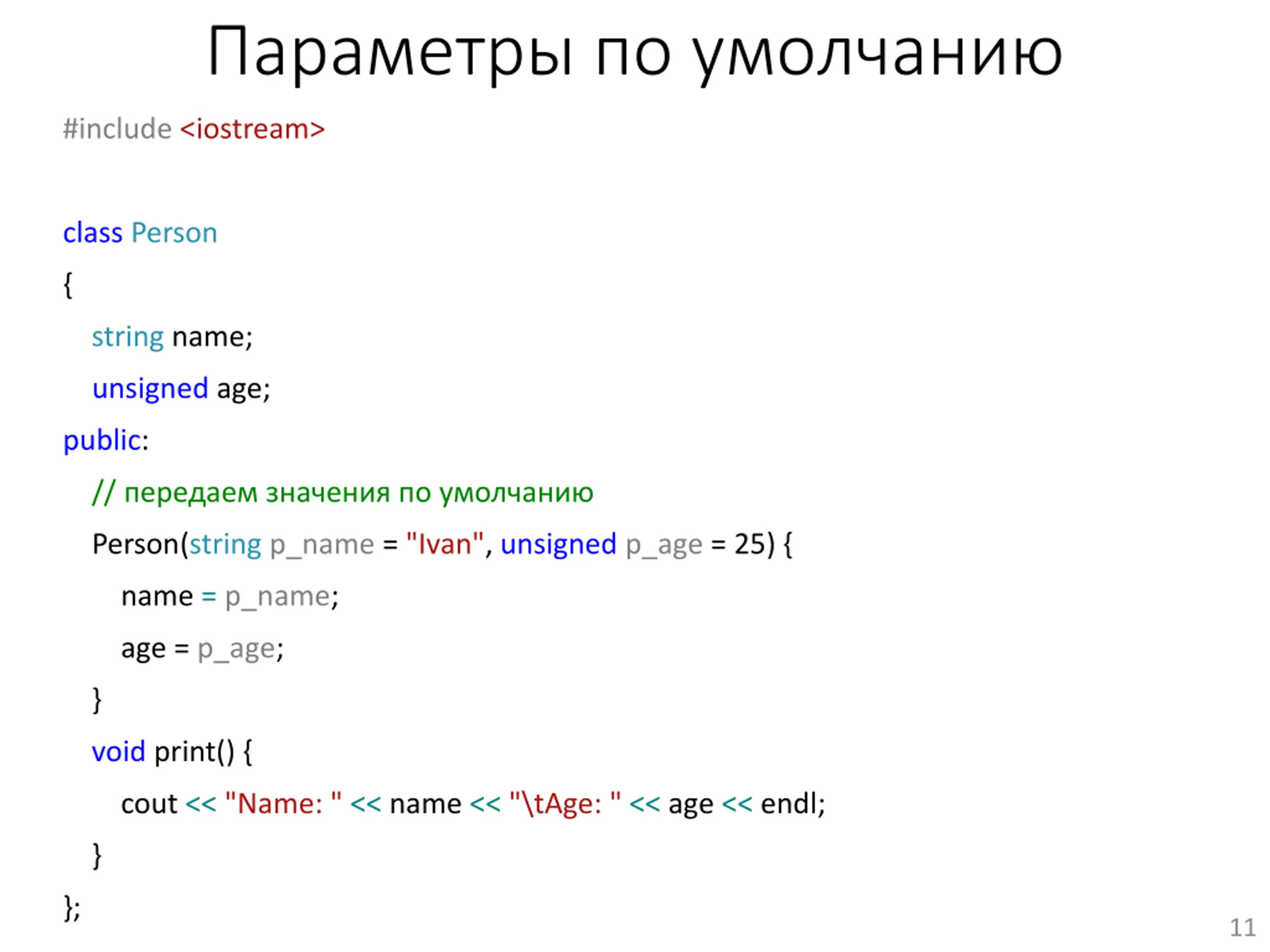 #include <iostream> class Person { string name; unsigned age; public: // Person(string p_name = "Ivan", unsigned p_age = 25) { name = p_name; age = p_age; } void print() { cout << "Name: " << name << "\tAge: " << age << endl; } }; 11