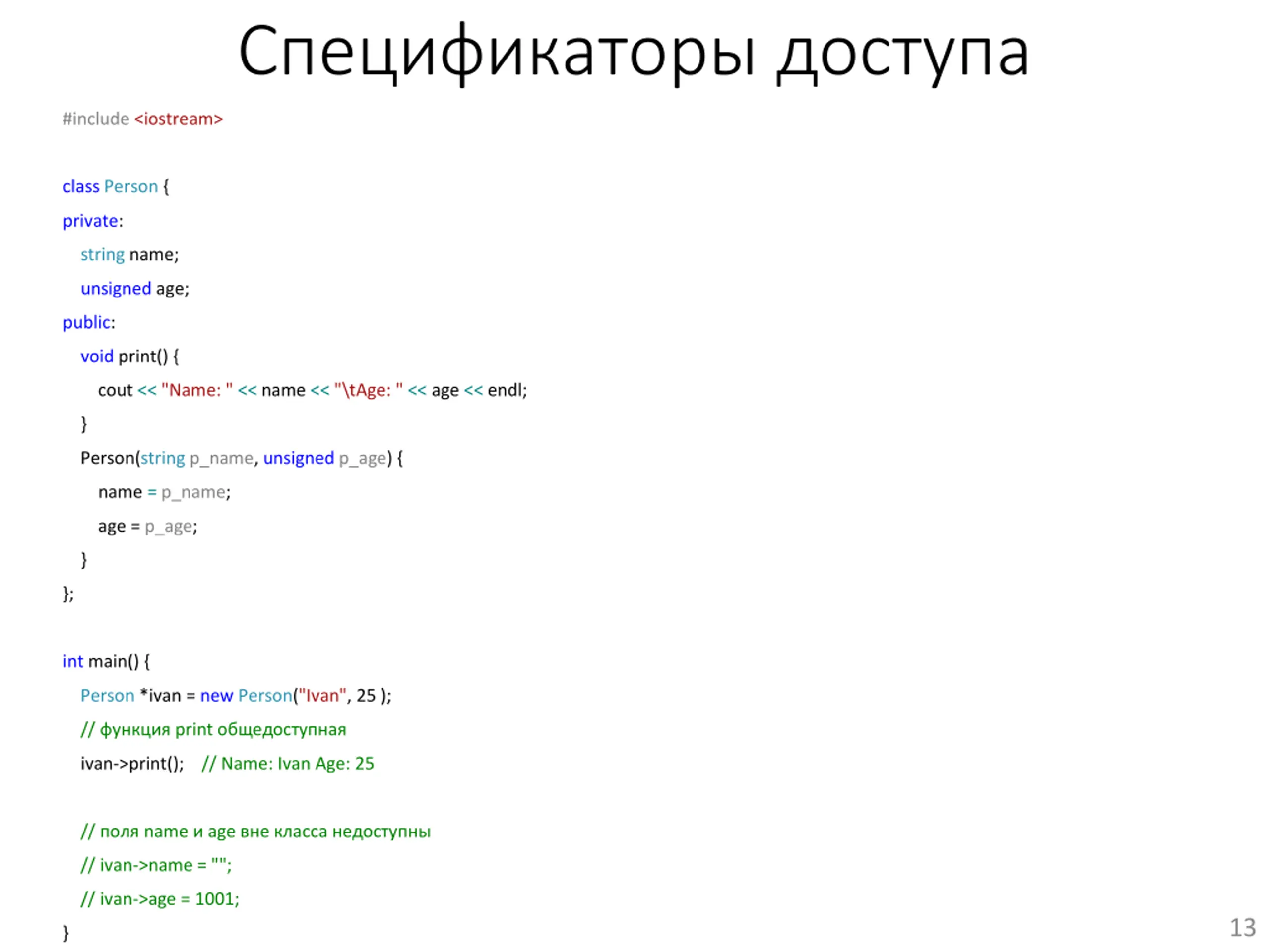#include <iostream> class Person { private: string name; unsigned age; public: void print() { cout << "Name: " << name << "\tAge: " << age << endl; } Person(string p_name, unsigned p_age) { name = p_name; age = p_age; } }; int main() { Person *ivan = new Person("Ivan", 25 ); // print ivan->print(); // Name: Ivan Age: 25 // name age // ivan->name = ""; // ivan->age = 1001; 13 }
