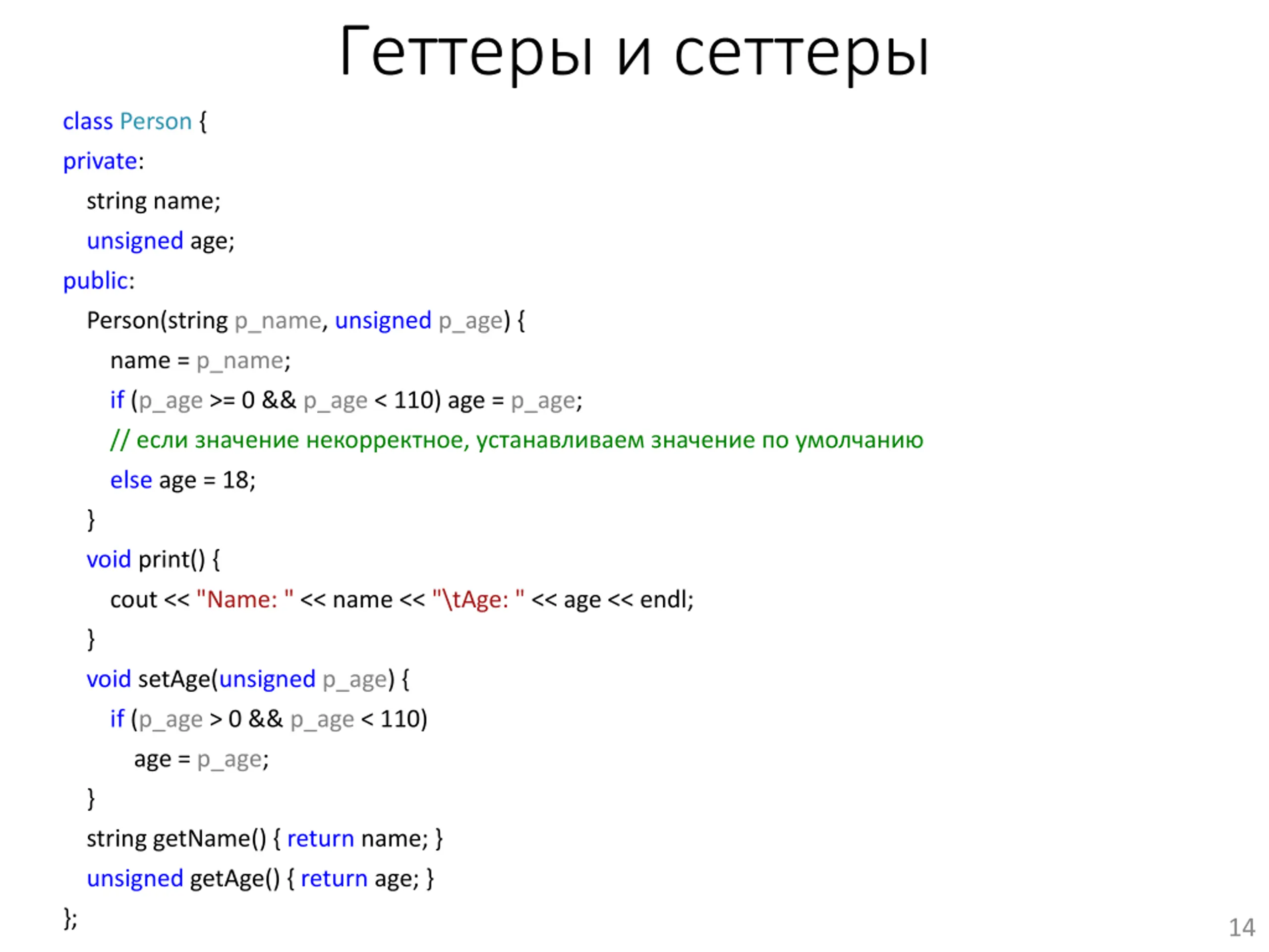 class Person { private: string name; unsigned age; public: Person(string p_name, unsigned p_age) { name = p_name; if (p_age >= 0 && p_age < 110) age = p_age; // , else age = 18; } void print() { cout << "Name: " << name << "\tAge: " << age << endl; } void setAge(unsigned p_age) { if (p_age > 0 && p_age < 110) age = p_age; } string getName() { return name; } unsigned getAge() { return age; } }; 14