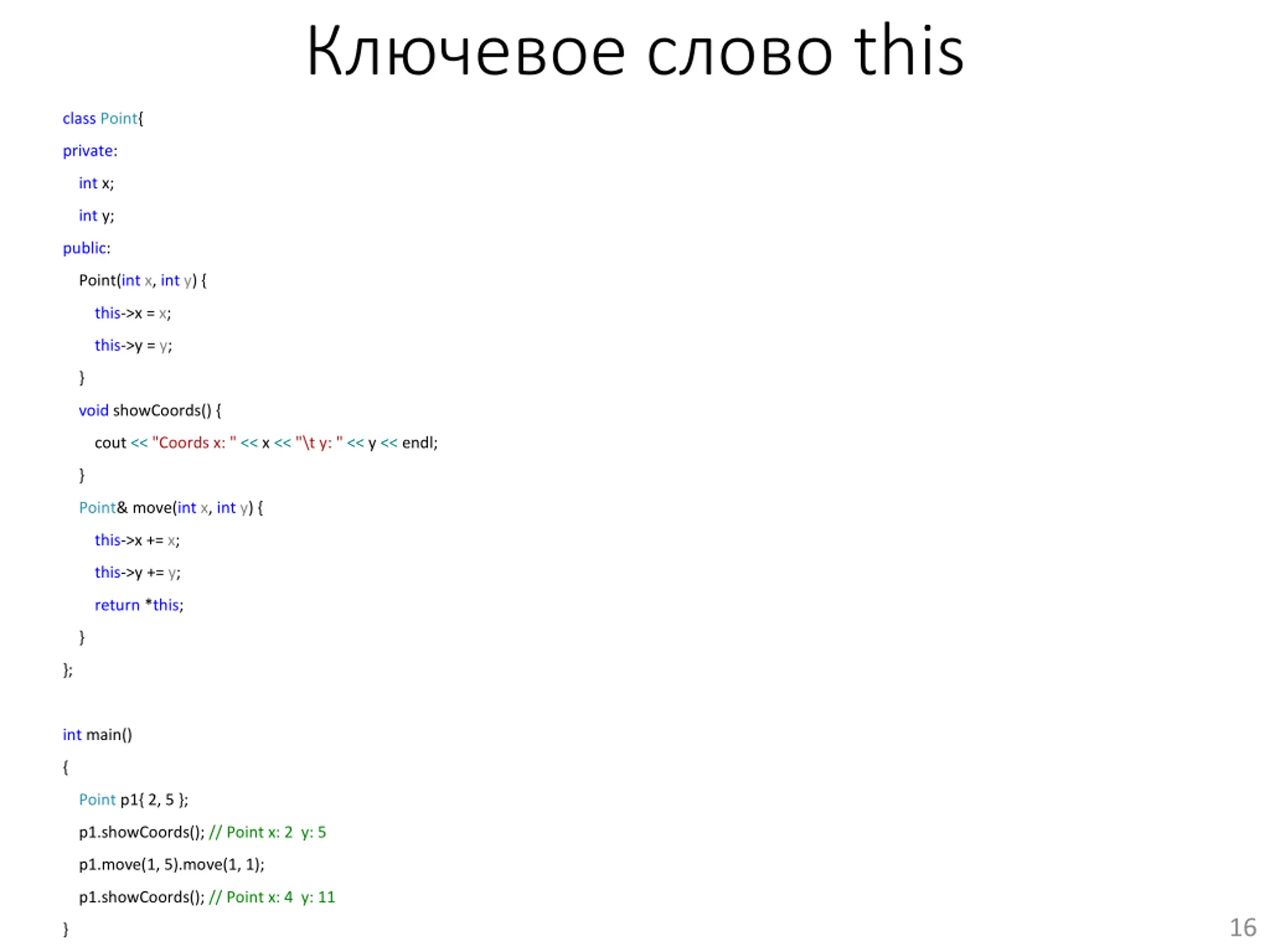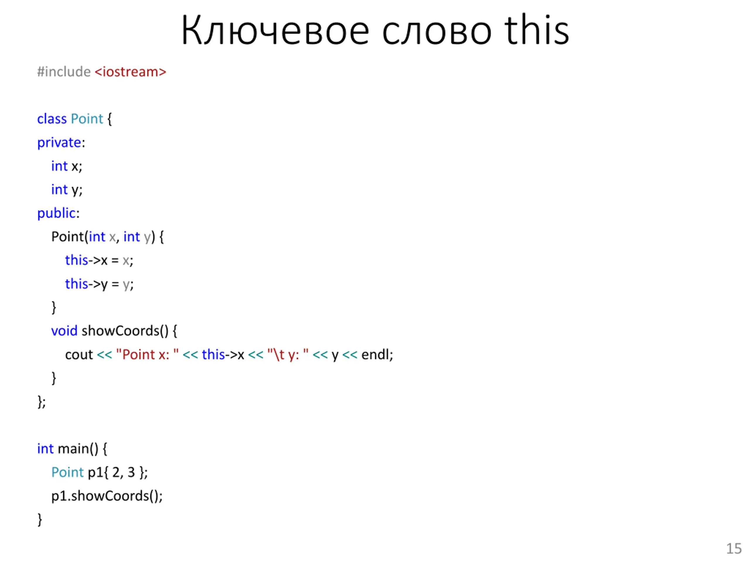 this #include <iostream> class Point { private: int x; int y; public: Point(int x, int y) { this->x = x; this->y = y; } void showCoords() { cout << "Point x: " << this->x << "\t y: " << y << endl; } }; int main() { Point p1{ 2, 3 }; p1.showCoords(); } 15