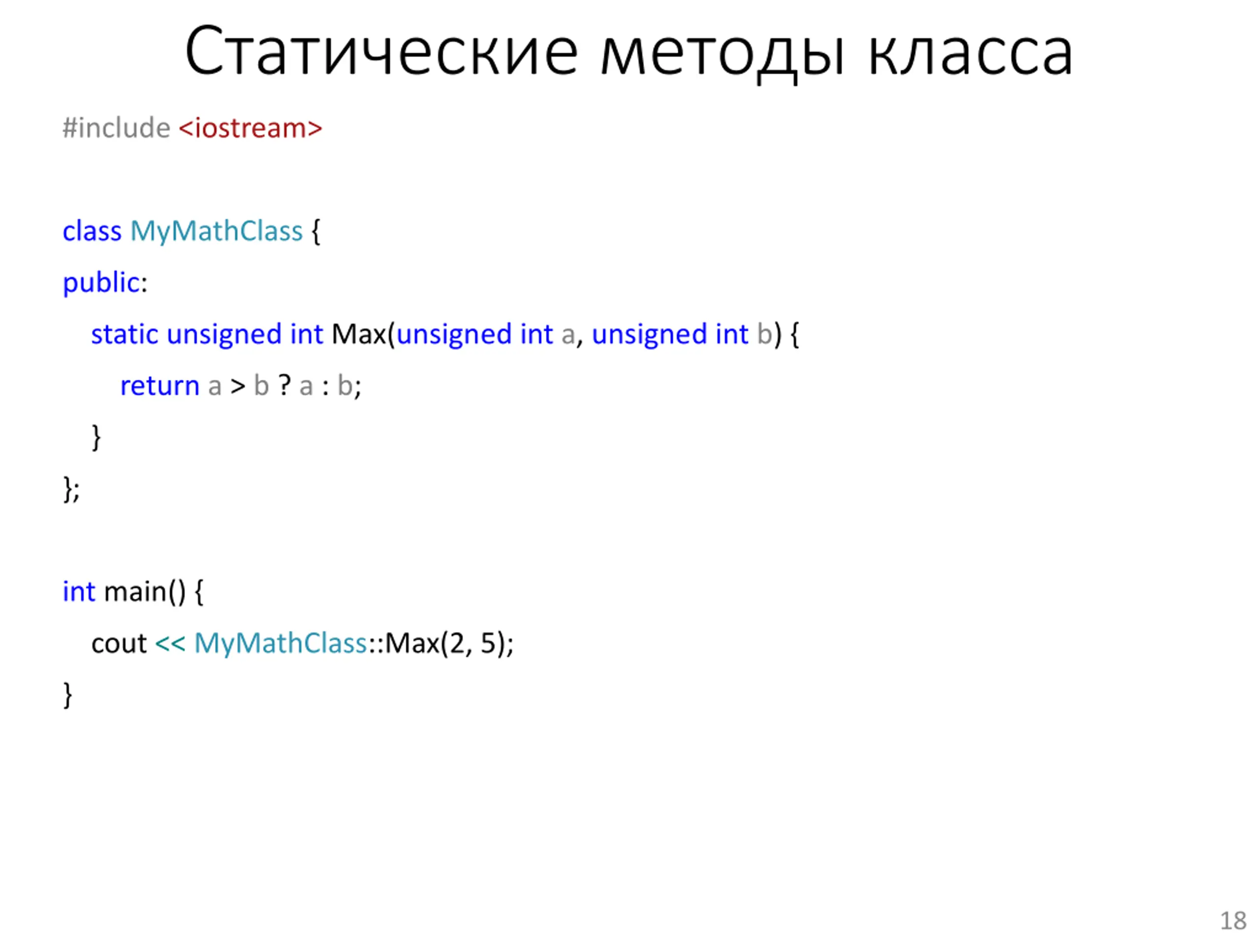 #include <iostream> class MyMathClass { public: static unsigned int Max(unsigned int a, unsigned int b) { return a > b ? a : b; } }; int main() { cout << MyMathClass::Max(2, 5); } 18