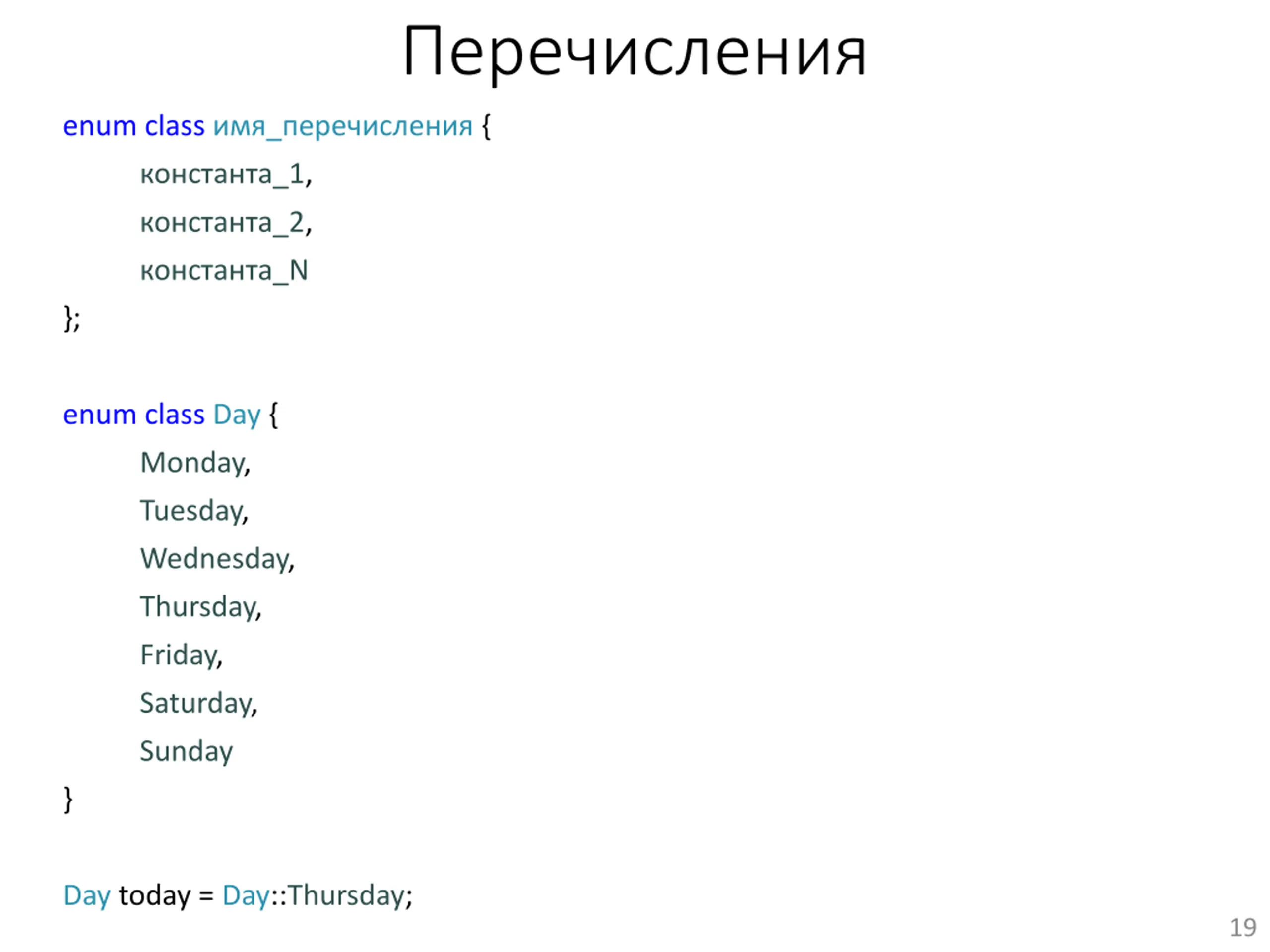 enum class _ { _1, _2, _N }; enum class Day { Monday, Tuesday, Wednesday, Thursday, Friday, Saturday, Sunday } Day today = Day::Thursday; 19