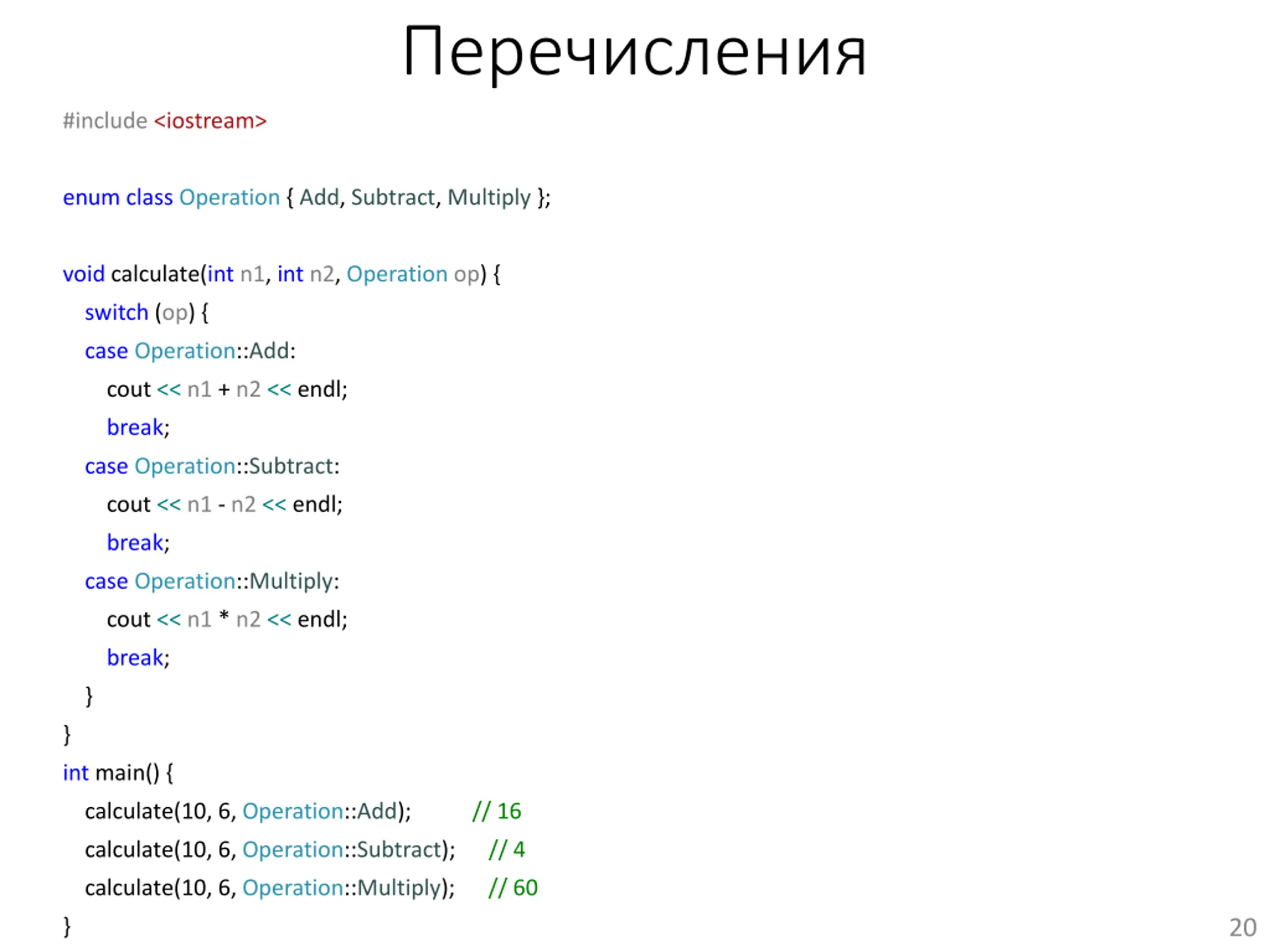 #include <iostream> enum class Operation { Add, Subtract, Multiply }; void calculate(int n1, int n2, Operation op) { switch (op) { case Operation::Add: cout << n1 + n2 << endl; break; case Operation::Subtract: cout << n1 - n2 << endl; break; case Operation::Multiply: cout << n1 * n2 << endl; break; } } int main() { calculate(10, 6, Operation::Add); // 16 calculate(10, 6, Operation::Subtract); // 4 calculate(10, 6, Operation::Multiply); // 60 20 }