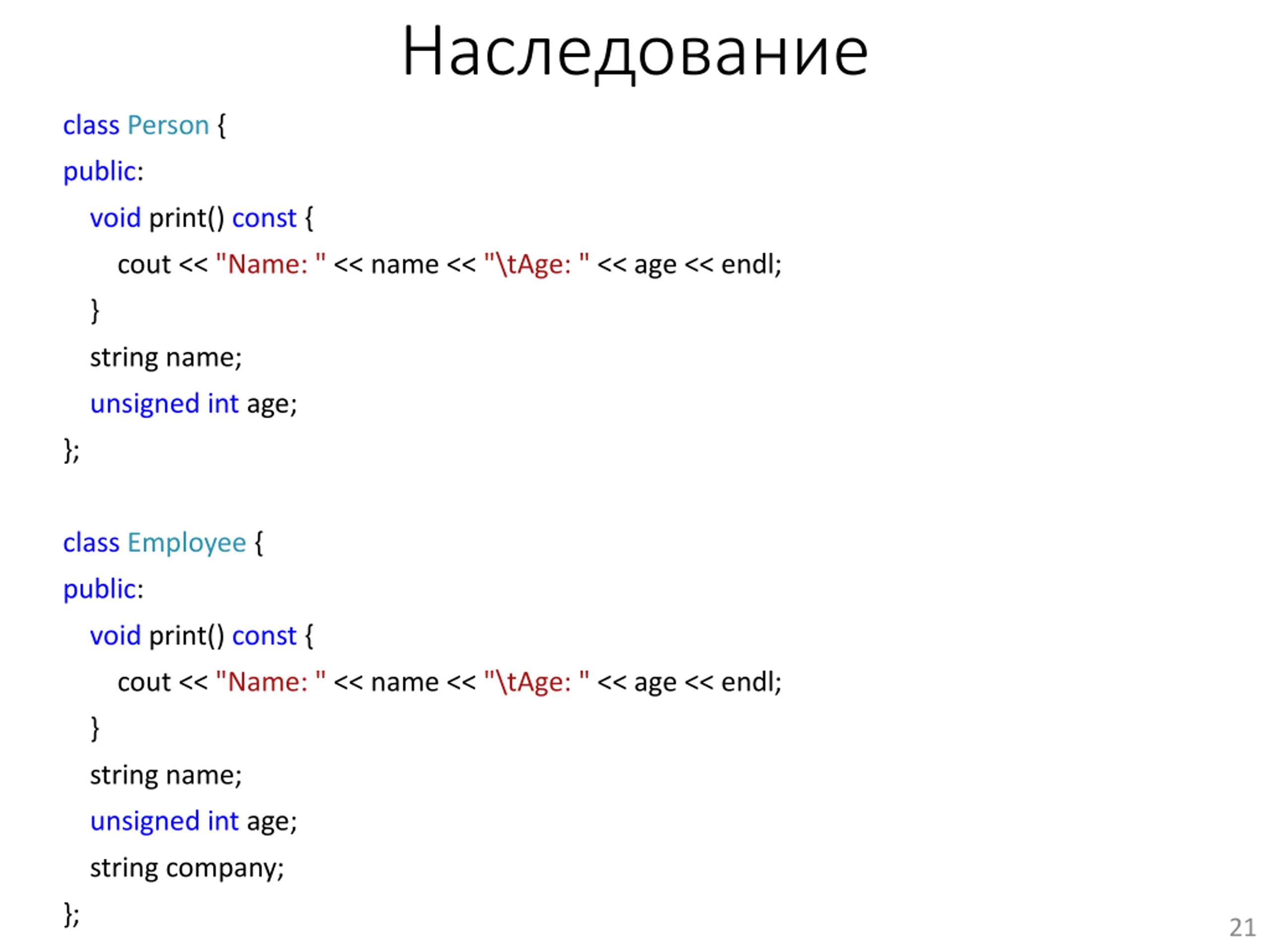 class Person { public: void print() const { cout << "Name: " << name << "\tAge: " << age << endl; } string name; unsigned int age; }; class Employee { public: void print() const { cout << "Name: " << name << "\tAge: " << age << endl; } string name; unsigned int age; string company; }; 21