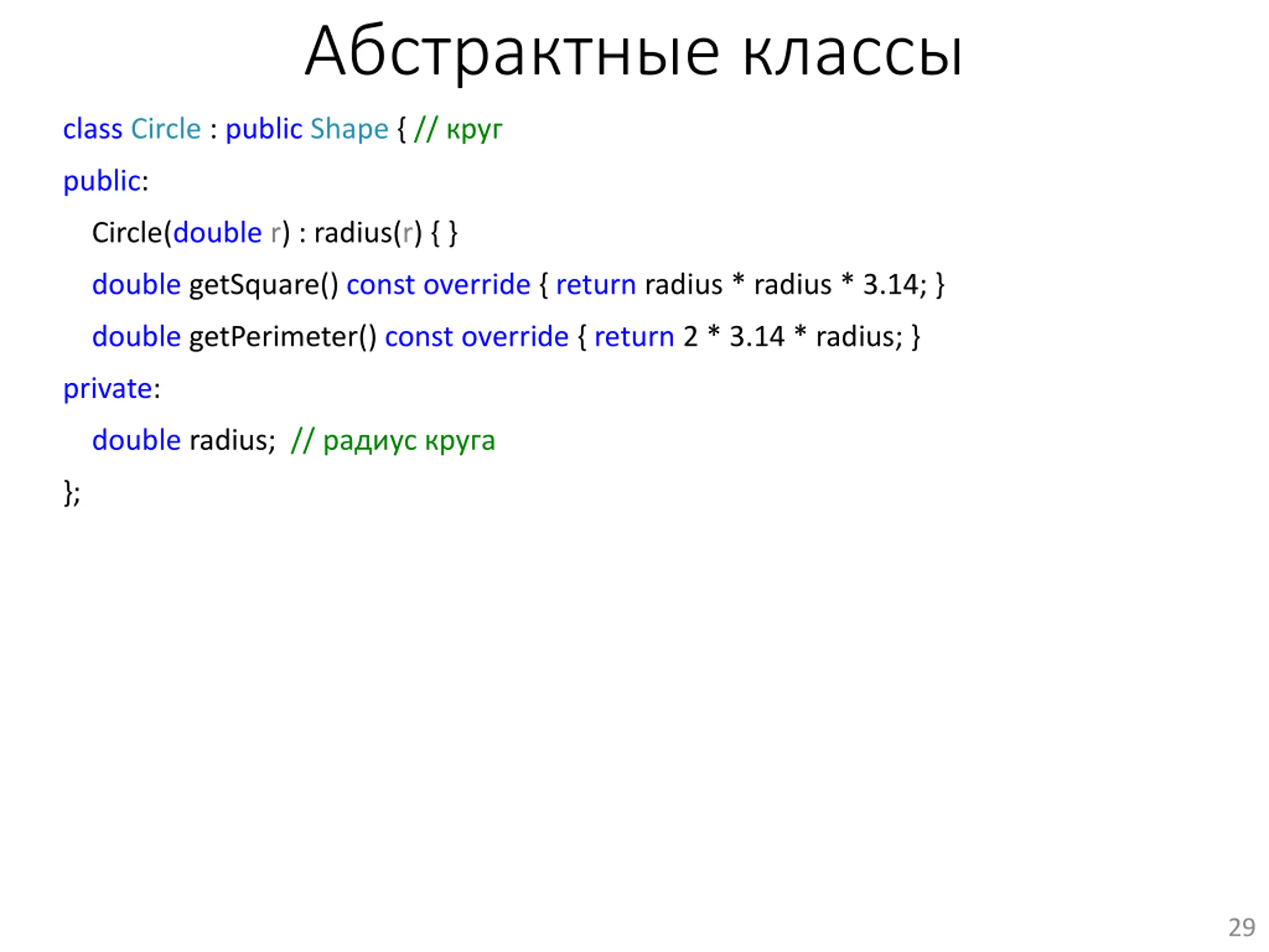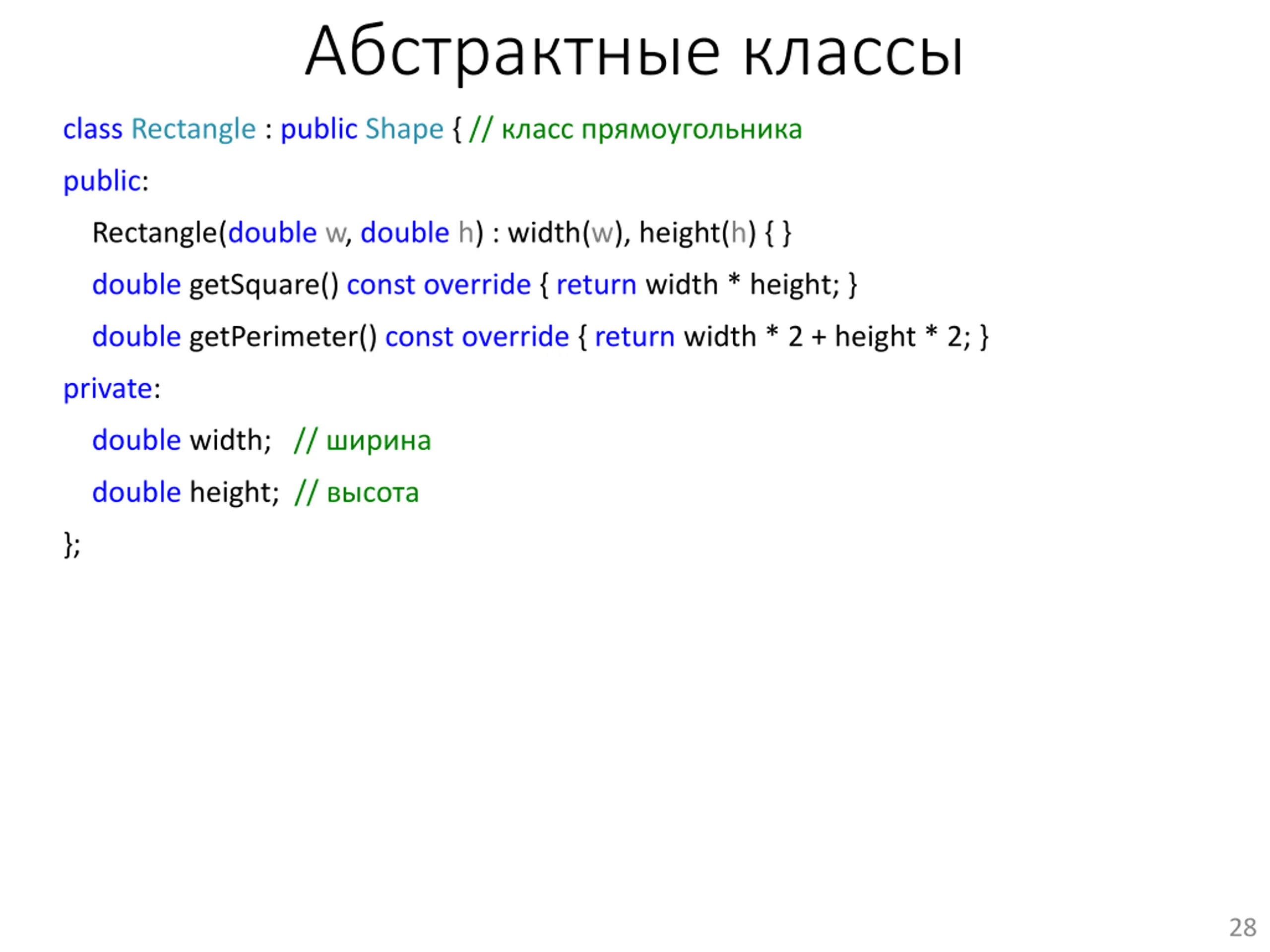 class Rectangle : public Shape { // public: Rectangle(double w, double h) : width(w), height(h) { } double getSquare() const override { return width * height; } double getPerimeter() const override { return width * 2 + height * 2; } private: double width; // double height; // }; 28