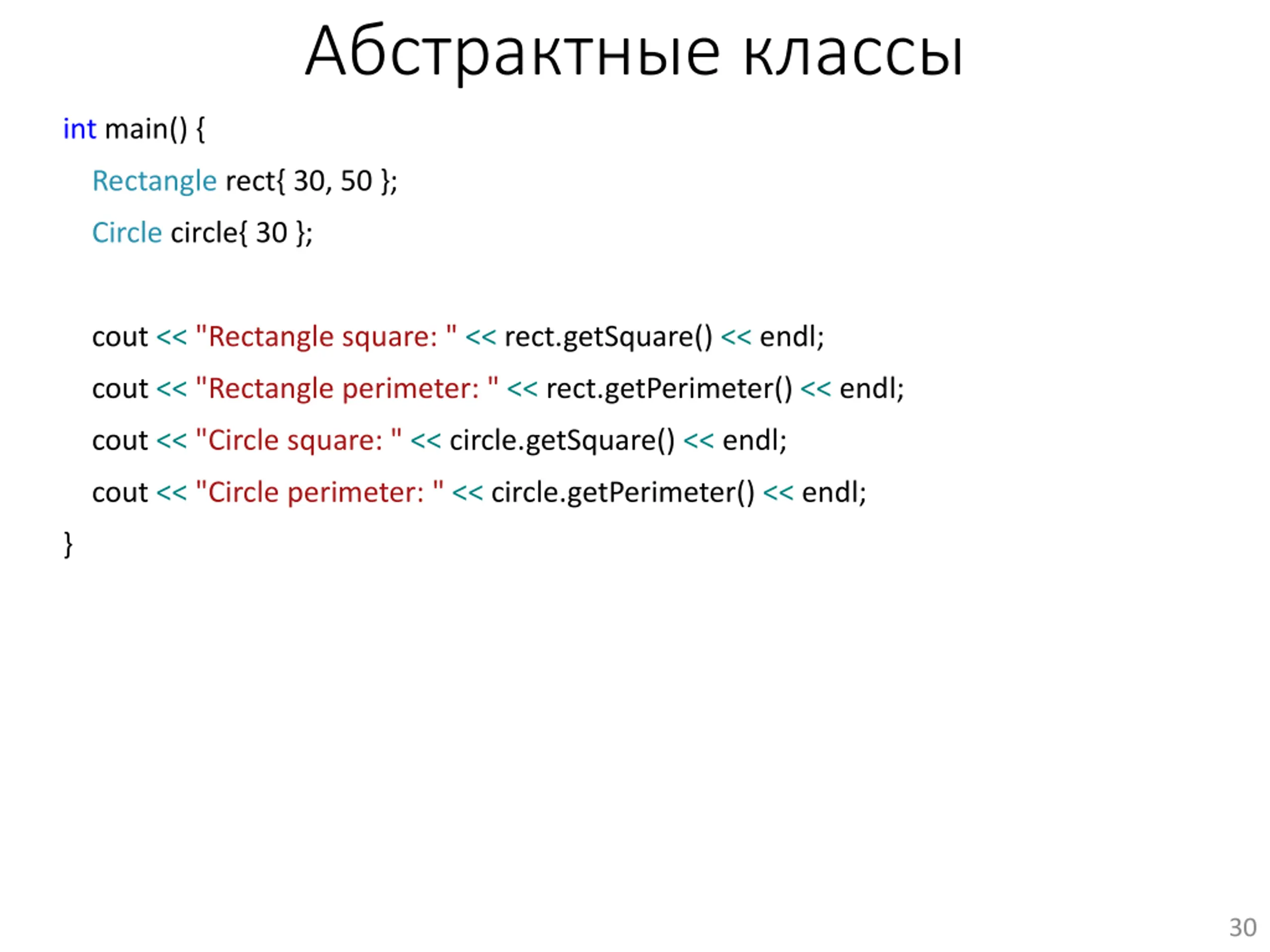 int main() { Rectangle rect{ 30, 50 }; Circle circle{ 30 }; cout << "Rectangle square: " << rect.getSquare() << endl; cout << "Rectangle perimeter: " << rect.getPerimeter() << endl; cout << "Circle square: " << circle.getSquare() << endl; cout << "Circle perimeter: " << circle.getPerimeter() << endl; } 30