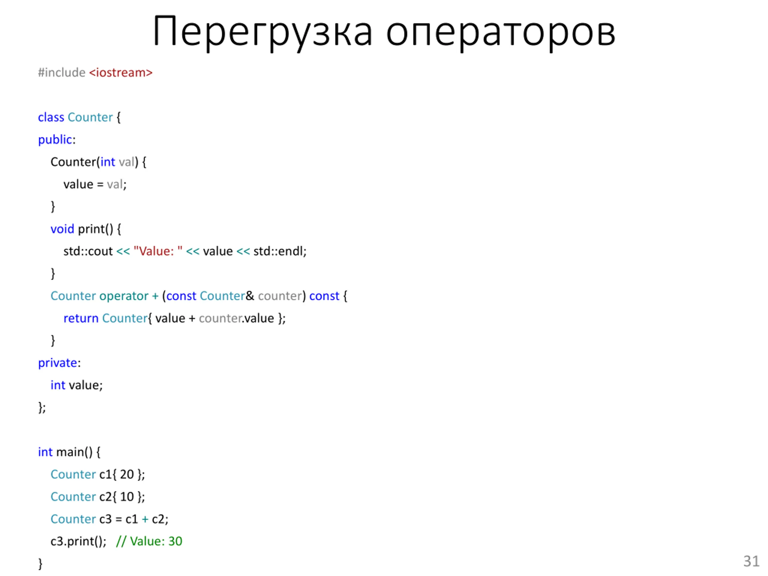 #include <iostream> class Counter { public: Counter(int val) { value = val; } void print() { std::cout << "Value: " << value << std::endl; } Counter operator + (const Counter& counter) const { return Counter{ value + counter.value }; } private: int value; }; int main() { Counter c1{ 20 }; Counter c2{ 10 }; Counter c3 = c1 + c2; c3.print(); // Value: 30 31 }