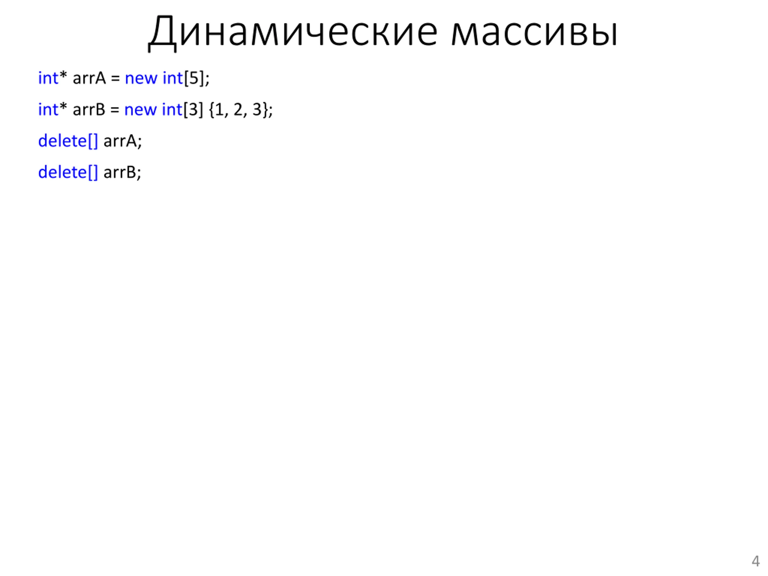 int* arrA = new int[5]; int* arrB = new int[3] {1, 2, 3}; delete[] arrA; delete[] arrB; 4