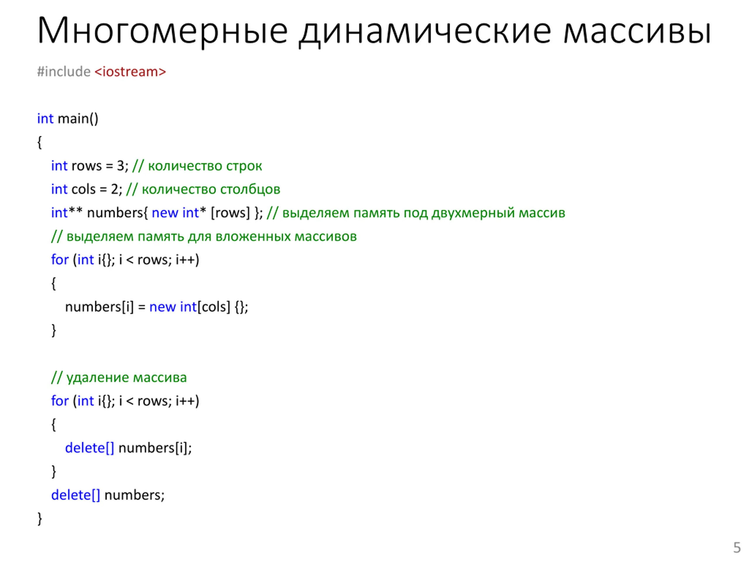 #include <iostream> int main() { int rows = 3; // int cols = 2; // int** numbers{ new int* [rows] }; // // for (int i{}; i < rows; i++) { numbers[i] = new int[cols] {}; } // for (int i{}; i < rows; i++) { delete[] numbers[i]; } delete[] numbers; } 5