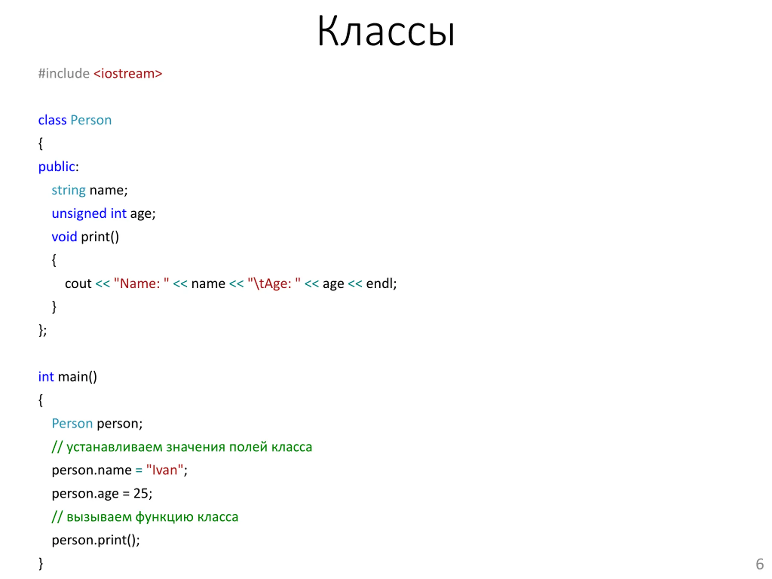 #include <iostream> class Person { public: string name; unsigned int age; void print() { cout << "Name: " << name << "\tAge: " << age << endl; } Person(string p_name, unsigned p_age) { name = p_name; age = p_age; } }; int main() { Person *ivan = new Person("Ivan", 25); // name, age print ivan->name = "Vasya"; ivan->age = 1001; ivan->print(); // Name: Vasya Age: 1001 12 }