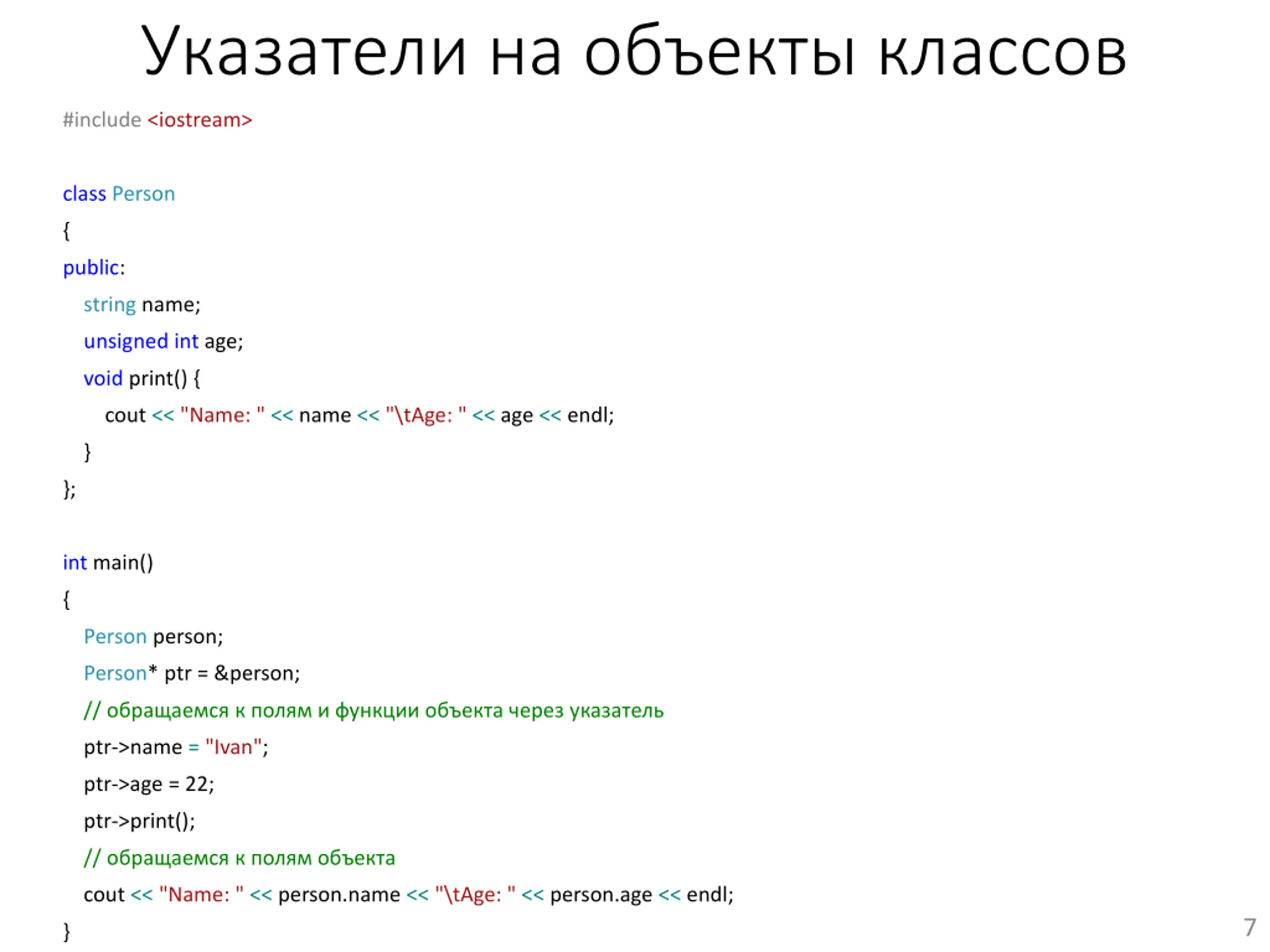 #include <iostream> class Person { public: string name; unsigned int age; void print() { cout << "Name: " << name << "\tAge: " << age << endl; } }; int main() { Person person; Person* ptr = &person; // ptr->name = "Ivan"; ptr->age = 22; ptr->print(); // cout << "Name: " << person.name << "\tAge: " << person.age << endl; 7 }