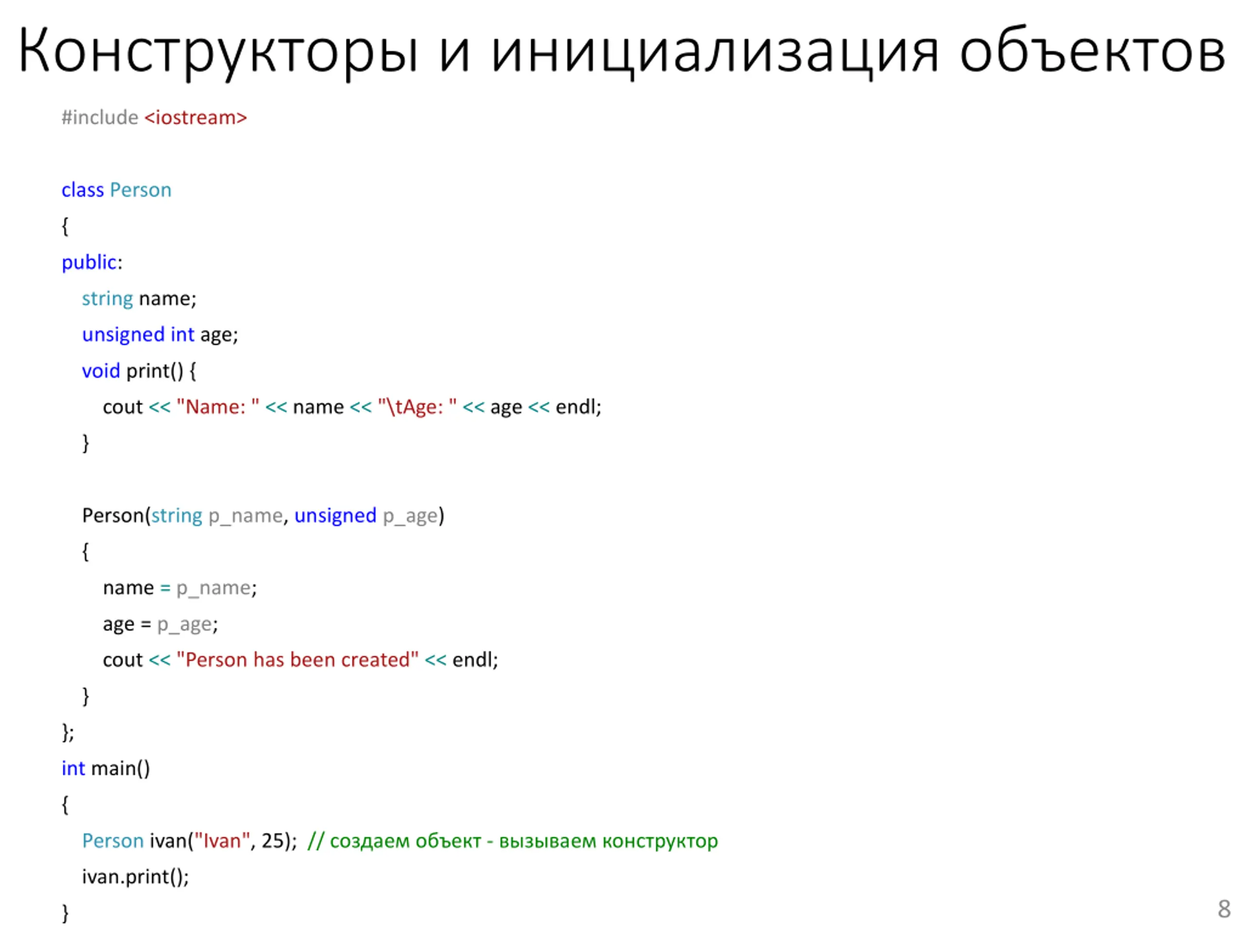 #include <iostream> class Person { public: string name; unsigned int age; void print() { cout << "Name: " << name << "\tAge: " << age << endl; } Person(string p_name, unsigned p_age) { name = p_name; age = p_age; cout << "Person has been created" << endl; } }; int main() { Person ivan("Ivan", 25); // - ivan.print(); 8 }