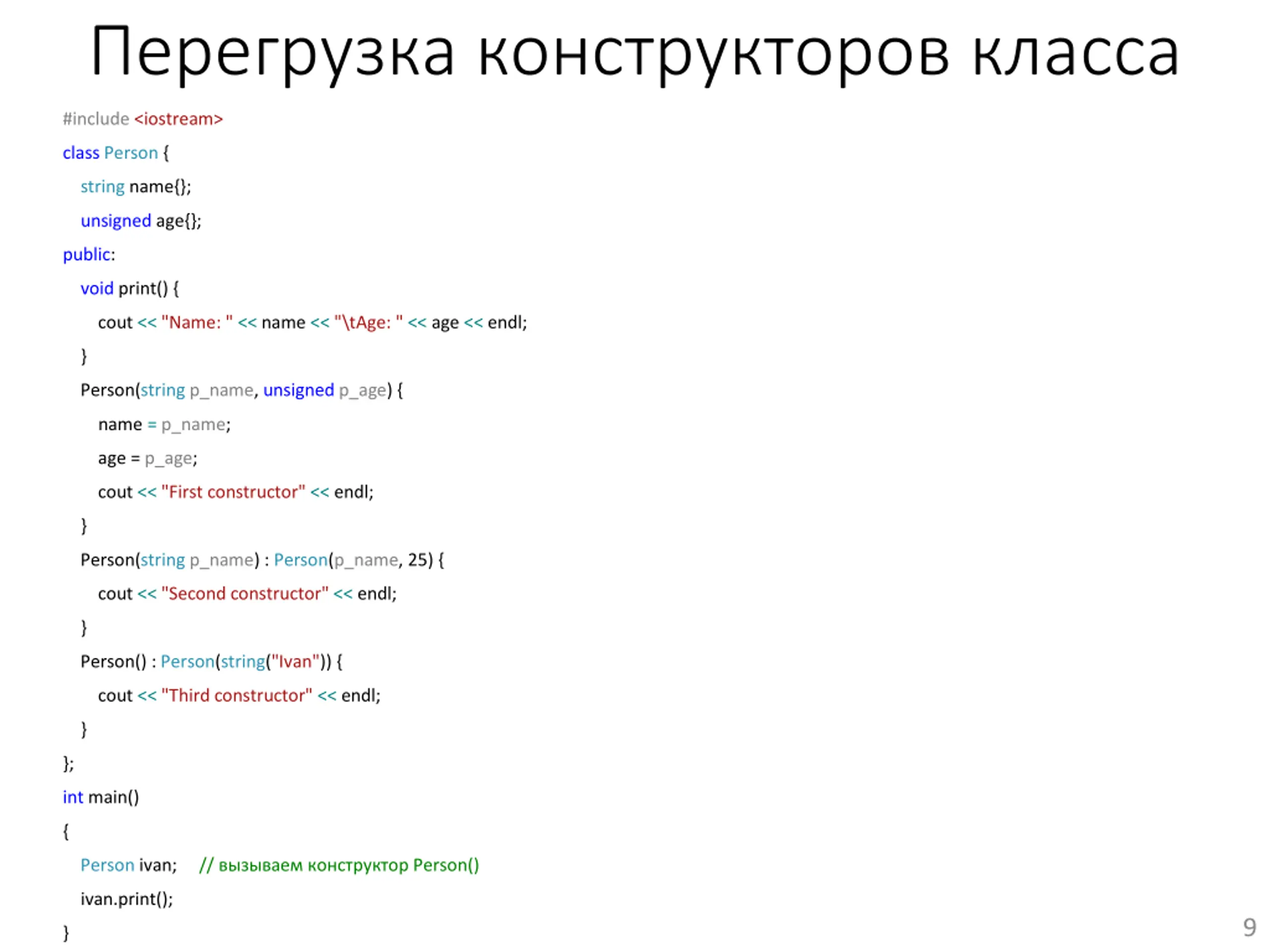 #include <iostream> class Person { string name{}; unsigned age{}; public: void print() { cout << "Name: " << name << "\tAge: " << age << endl; } Person(string p_name, unsigned p_age) { name = p_name; age = p_age; cout << "First constructor" << endl; } Person(string p_name) : Person(p_name, 25) { cout << "Second constructor" << endl; } Person() : Person(string("Ivan")) { cout << "Third constructor" << endl; } }; int main() { Person ivan; // Person() ivan.print(); 9 }