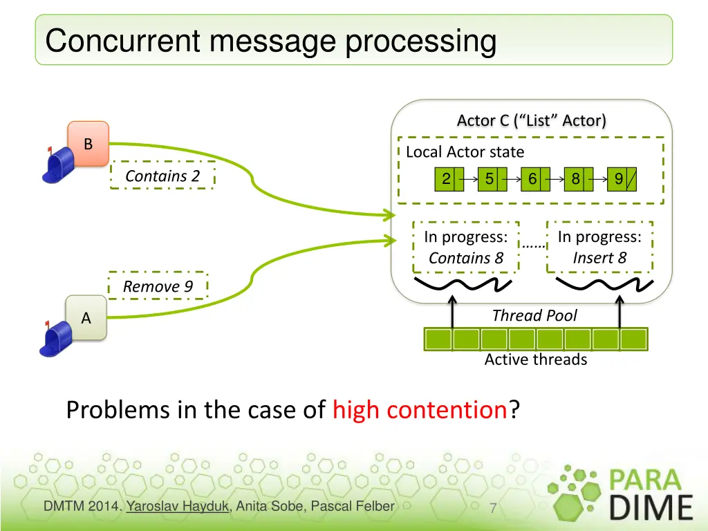 Concurrent message processing Actor C ( List Actor) B Local Actor state Contains 2 2 5 6 8 9 In progress: Insert 8 In progress: Contains 8 Remove 9 Thread Pool A Active threads Problems in the case of high contention? DMTM 2014. Yaroslav Hayduk, Anita Sobe, Pascal Felber 7