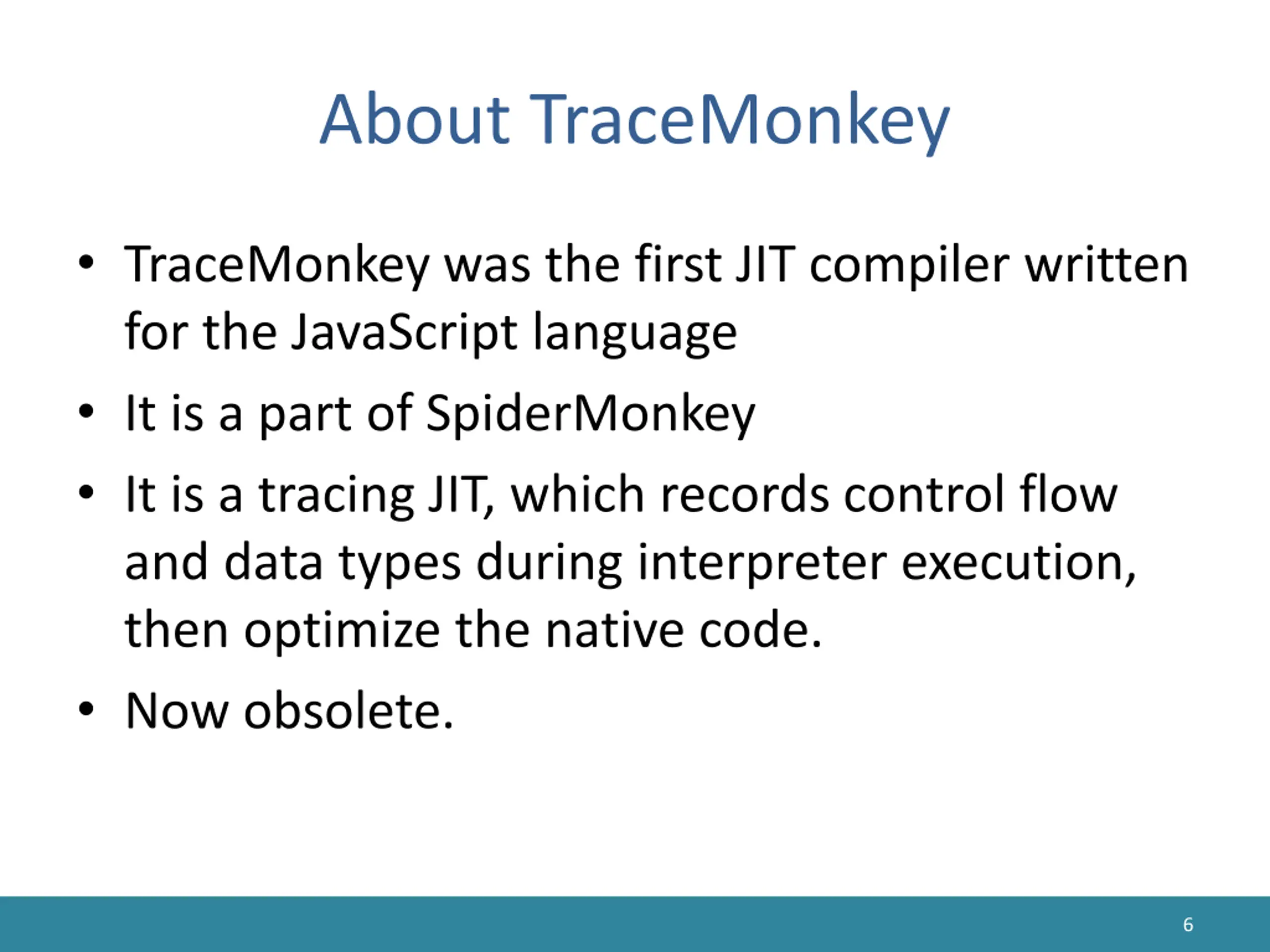 About TraceMonkey TraceMonkey was the first JIT compiler written for the JavaScript language It is a part of SpiderMonkey It is a tracing JIT, which records control flow and data types during interpreter execution, then optimize the native code. Now obsolete. 6