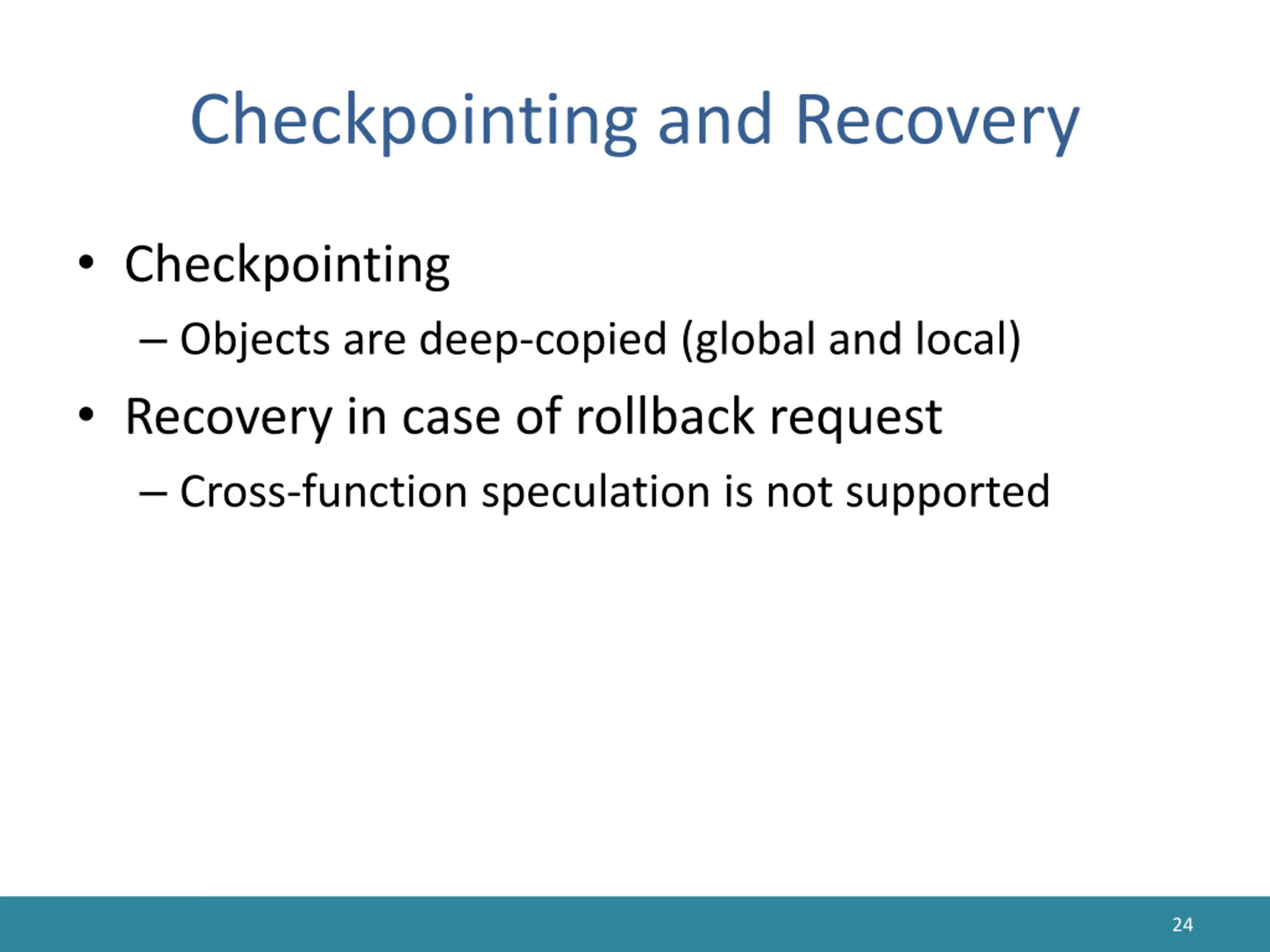 Checkpointing and Recovery Checkpointing Objects are deep-copied (global and local) Recovery in case of rollback request Cross-function speculation is not supported 24