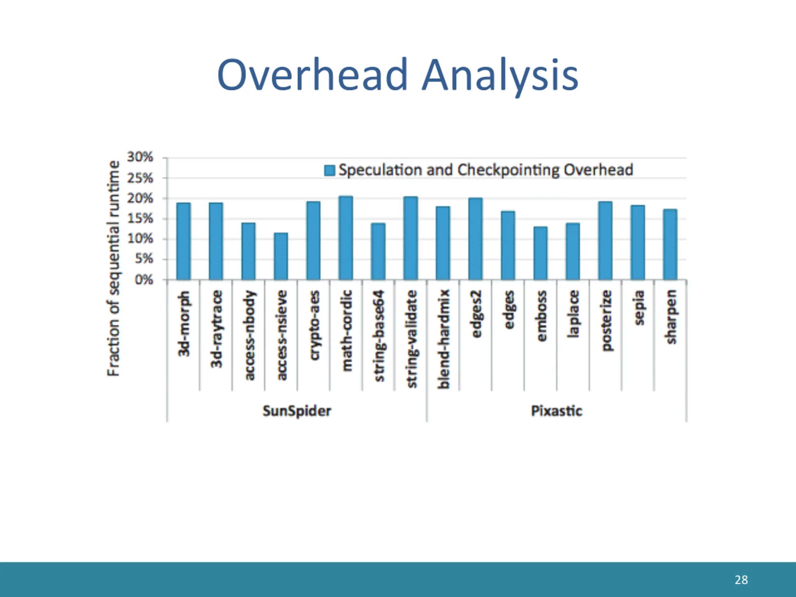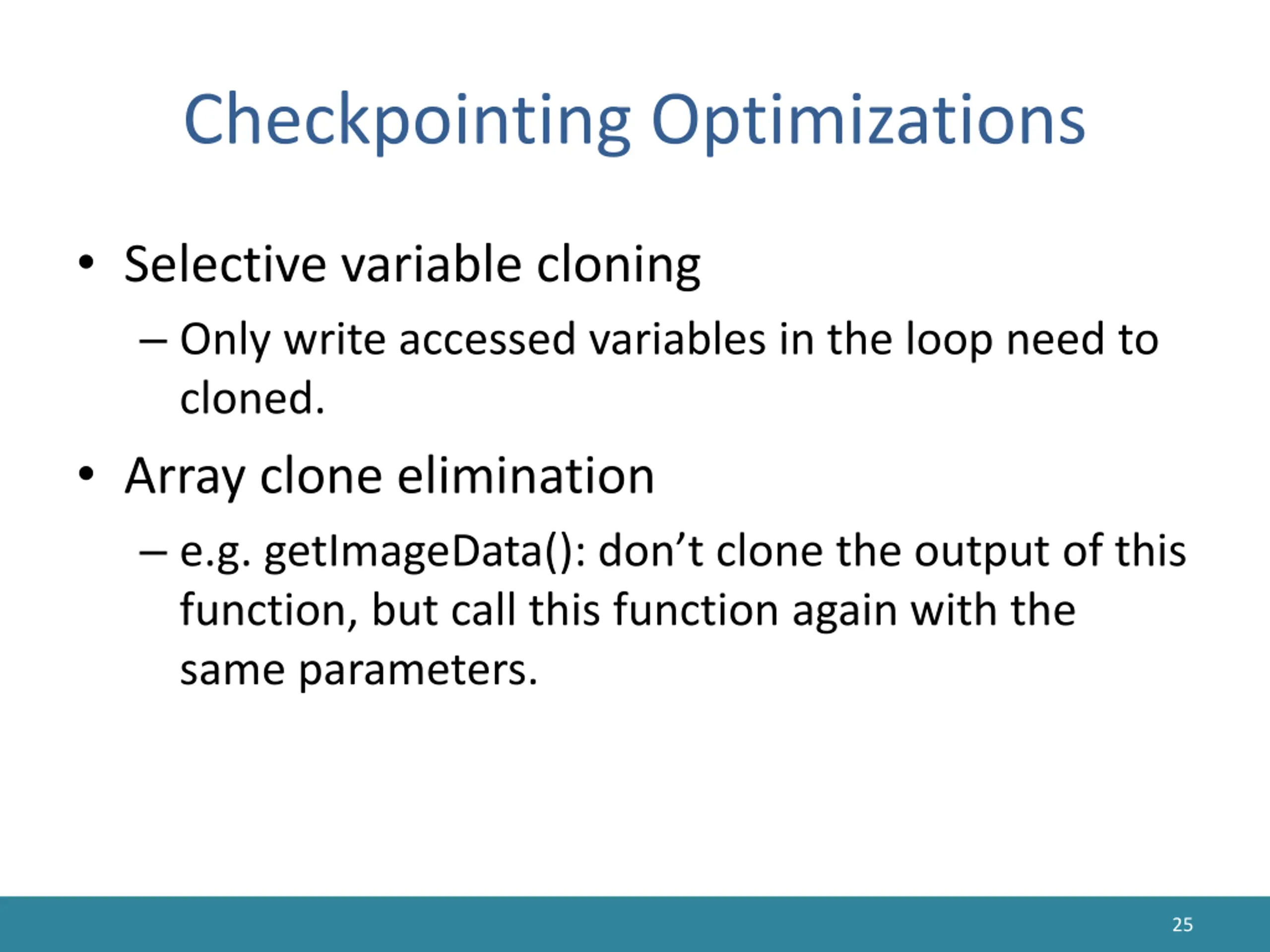 Checkpointing Optimizations Selective variable cloning Only write accessed variables in the loop need to cloned. Array clone elimination e.g. getImageData(): don t clone the output of this function, but call this function again with the same parameters. 25