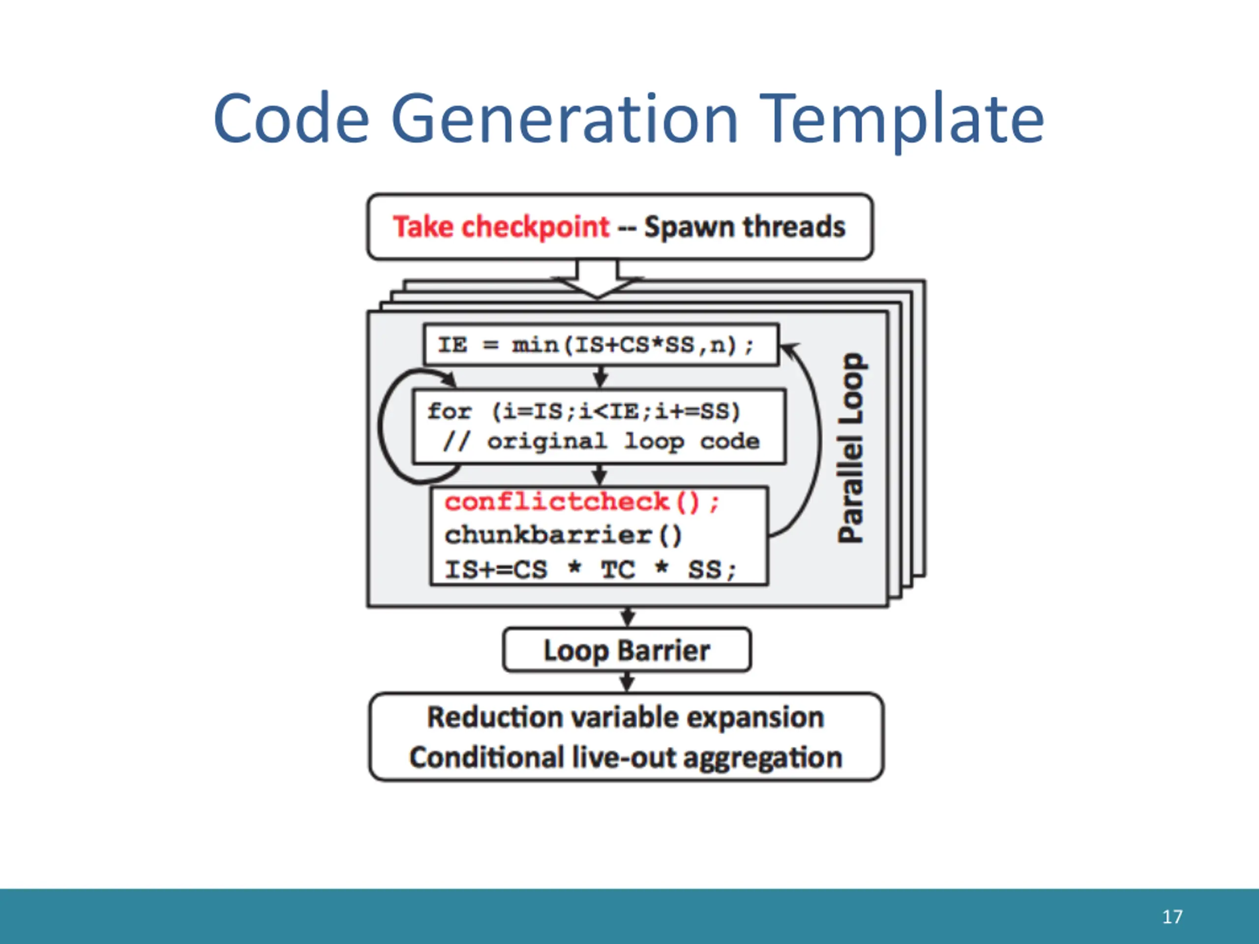 Parallel Code Generation original loop Iterations Chunk 1 Chunk 2 1 2 parallelized iterations in 2 threads Time saving Iterations Loop barrier Checkpoint Result cleanup Conflict check and chunk barrier 16